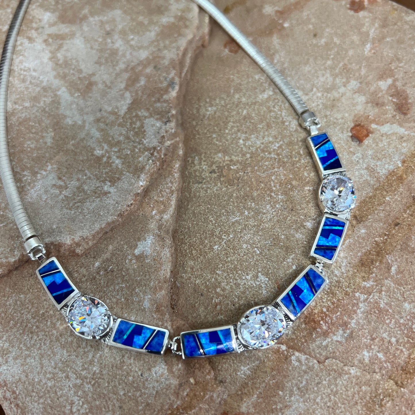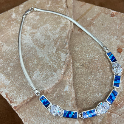 This gorgeous Sterling Silver Necklace, as part of the Blue Sky Collection, features Royal Lapis, Denim Lapis and Cultured Opal in a Fancy Inlaid Pattern, as well as 3 large Cubic Zirconia Gemstones. Includes Omega Chain.