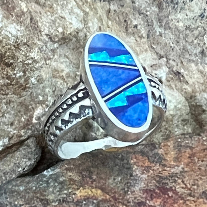 This beautiful Sterling Silver Ring, as part of the Blue Sky Collection, features Royal Lapis, Denim Lapis and Cultured Opal in a Fancy Inlaid Pattern.