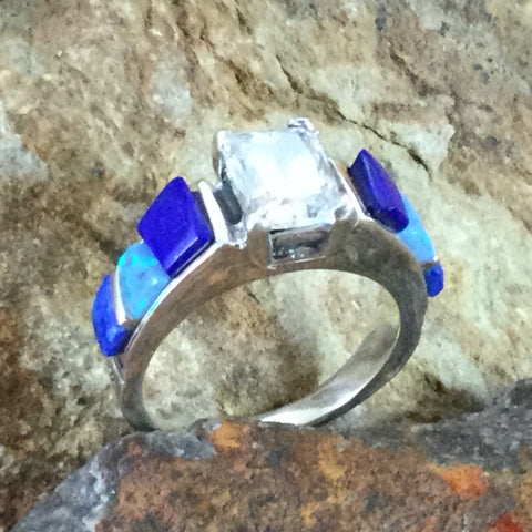 This beautiful Sterling Silver Ring, as part of the Amazing Light Collection features Royal Lapis, Denim Lapis and Cultured Opal in a Cobble Finish with a Cubic Zirconia.