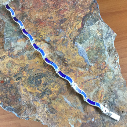 David Rosales Blue Water Inlaid Sterling Silver Wavy Link Bracelet