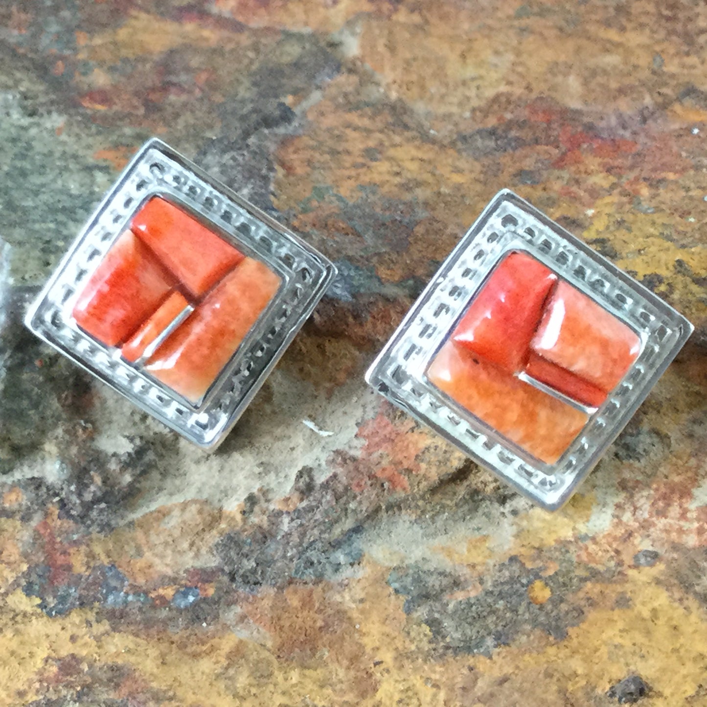 These gorgeous Sterling Silver Earrings, as part of the Desert Fire Collection, feature a Cobble Inlay pattern of Red and Orange Spiny Oyster Shell.