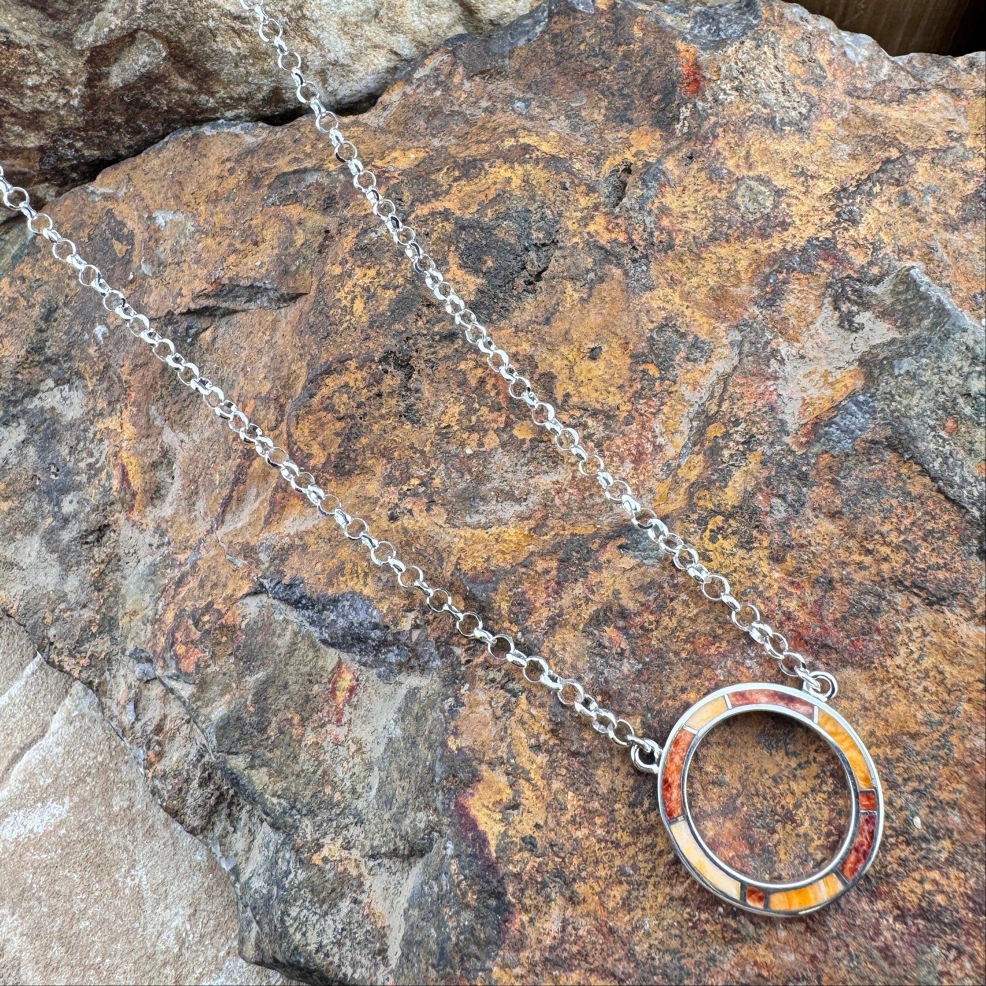 This gorgeous Sterling Silver Necklace, as part of the Desert Fire Collection, features Orange & Red Spiny Oyster. Includes Sterling Silver Chain.