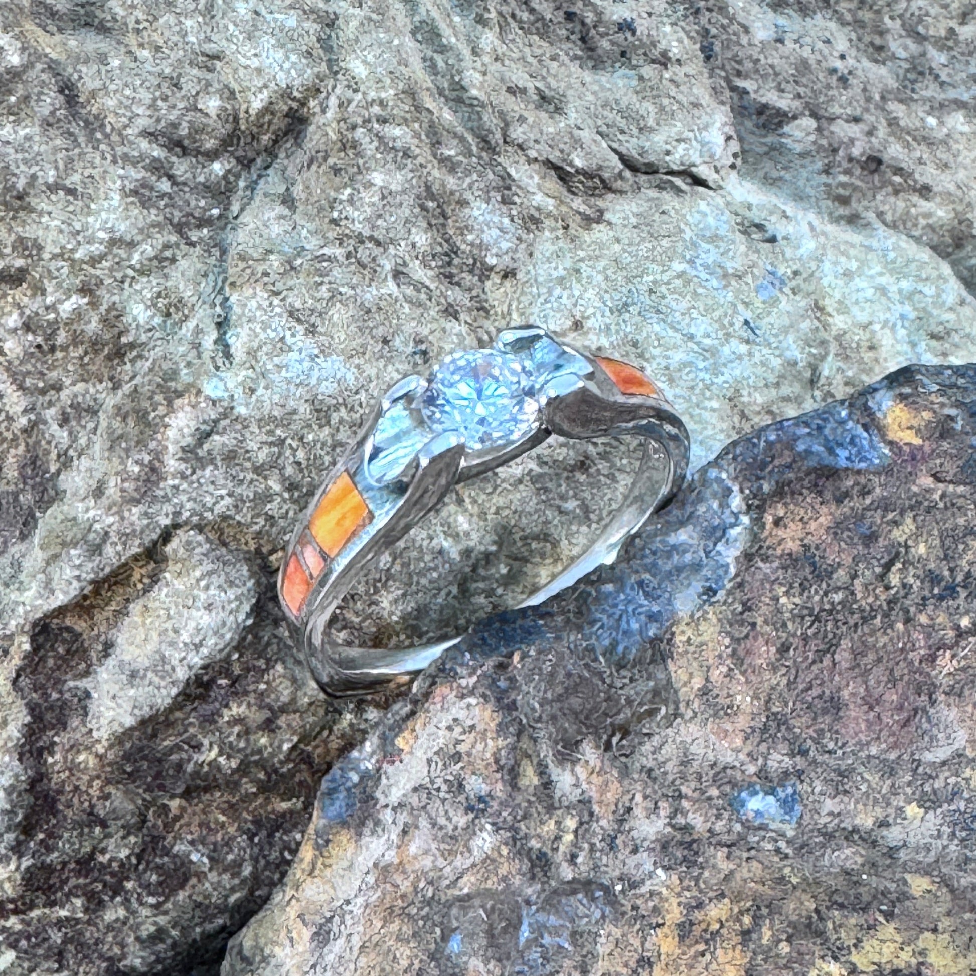 David Rosales Desert Fire Inlaid Sterling Silver Ring w/ Cubic Zirconia