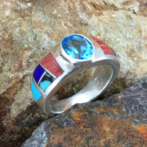 David Rosales Indian Summer Inlaid Sterling Silver Ring w/ Blue Topaz