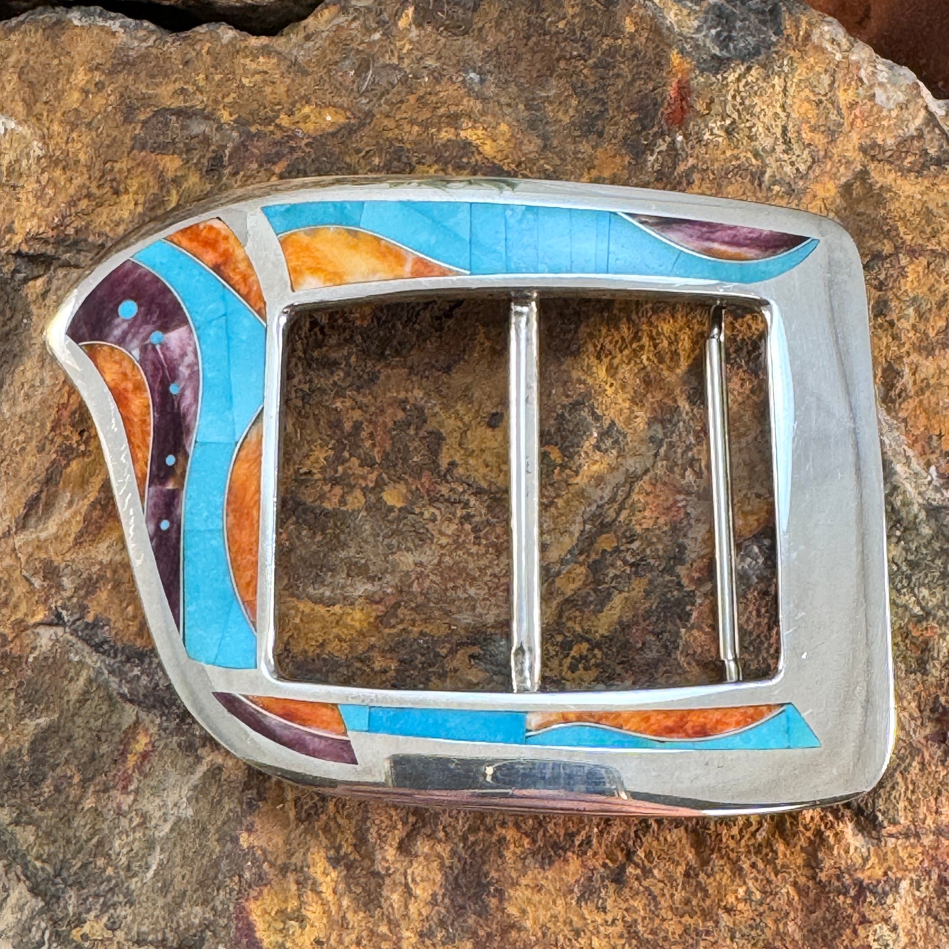 This striking sterling silver belt buckle is a masterwork by renowned jewelry designer David Rosales, celebrated for his bold contemporary designs. Set with a vibrant mosaic of natural Kingman turquoise, orange spiny oyster, and purple spiny oyster shell, the composition evokes fluid movement and Southwest landscapes in a sleek geometric form.