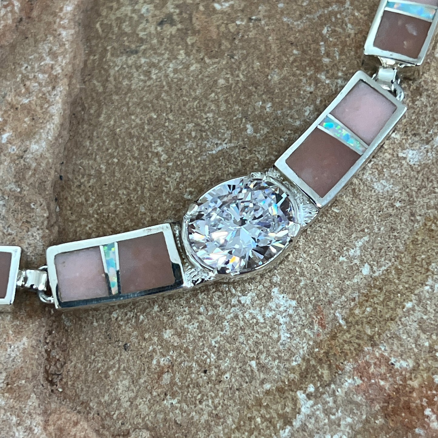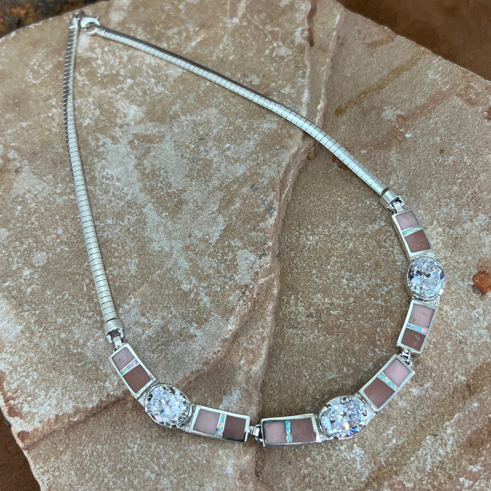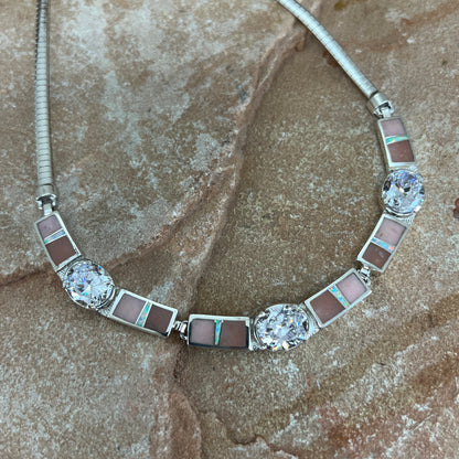This gorgeous Sterling Silver Necklace, is now part of the Make Me Blush Collection, features Rhodonite, Pink Peruvian Opal and White Lab Opal. as well as 3 large oval Cubic Zirconia Gemstones. Includes Omega Chain.