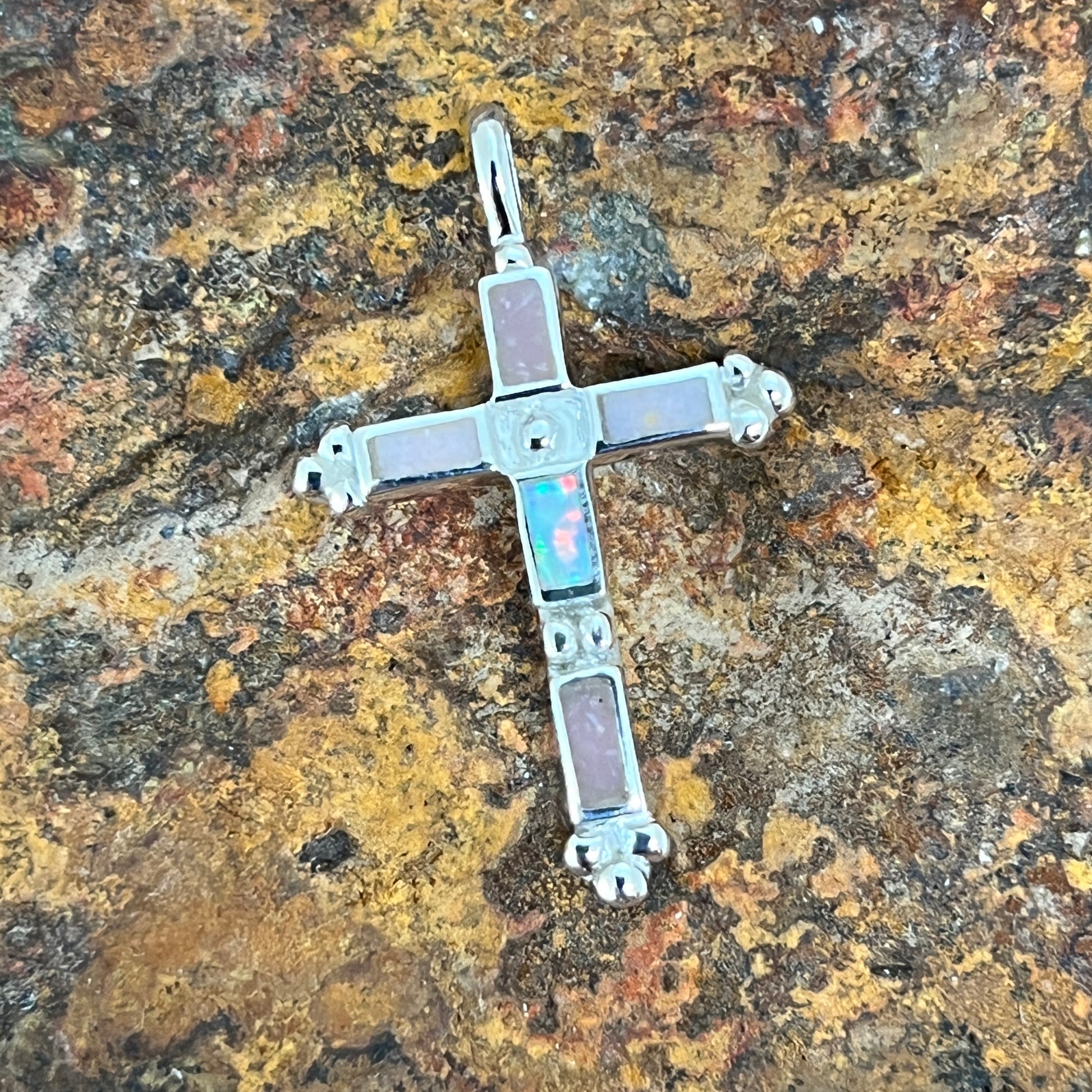 This beautiful Sterling Silver Cross, now part of the Make Me Blush Collection, features Rhodonite, Pink Peruvian Opal and White Lab Opal.