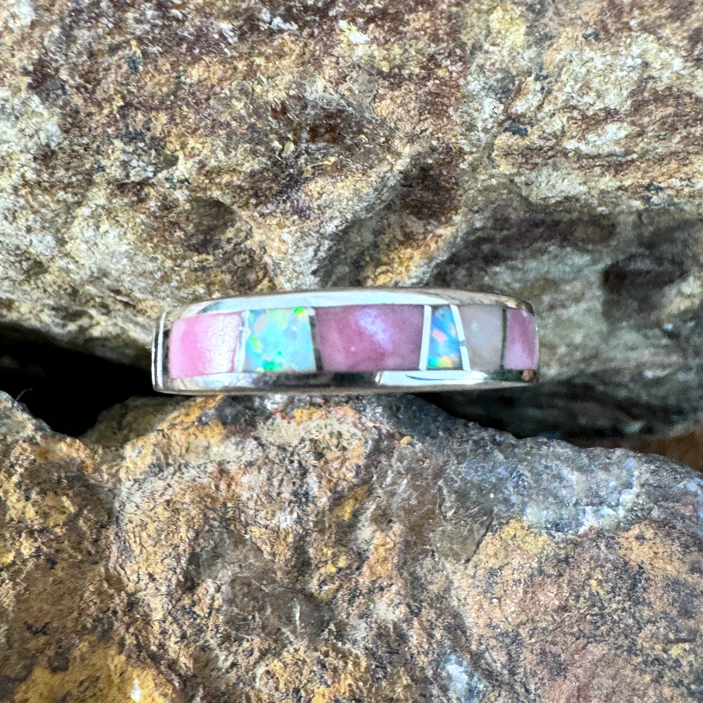 This beautiful Sterling Silver Ring, is now part of the Make Me Blush Collection, features Rhodonite, Pink Peruvian Opal and White Lab Opal.