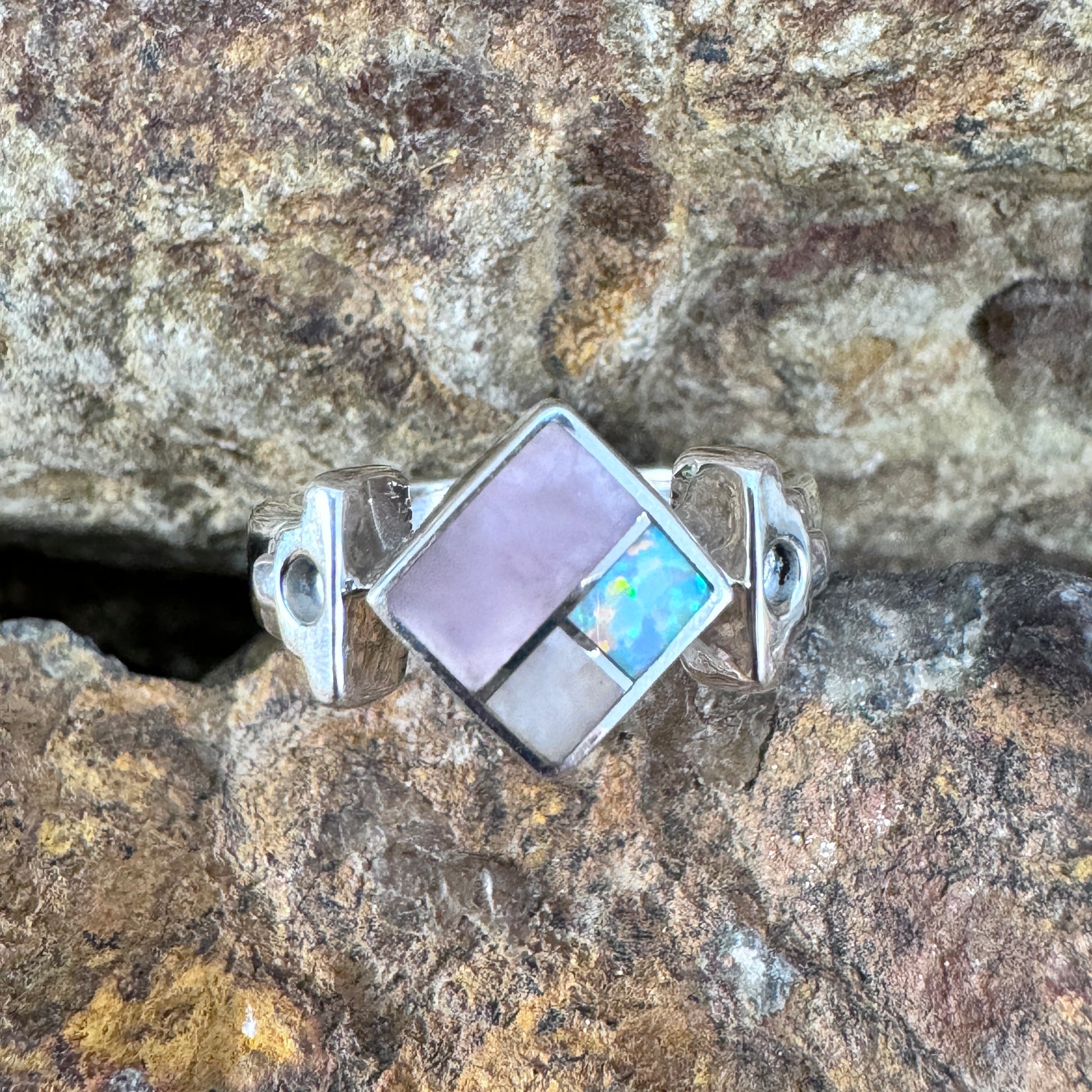 This petite Sterling Silver Ring is part of our Make Me Blush Collection. It features Rhodonite, Pink Peruvian Opal and White Lab Opal.