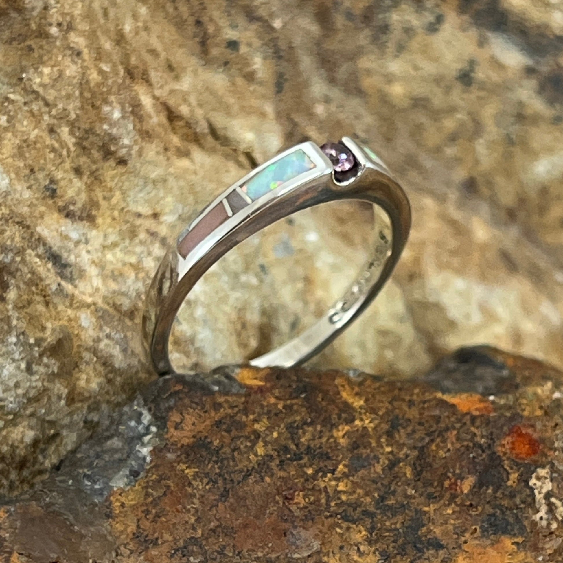 This beautiful Sterling Silver Ring, is now part of the Make Me Blush Collection, features Rhondonite, Pink Peruvian Opal and White Lab Opal with Pink Cubic Zirconia.