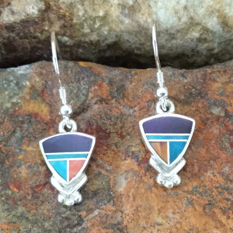 These gorgeous Sterling Silver Earrings, as part of the Morenci Sunset Collection features Morenci Turquoise, Sugilite and Spiny Oyster Shell