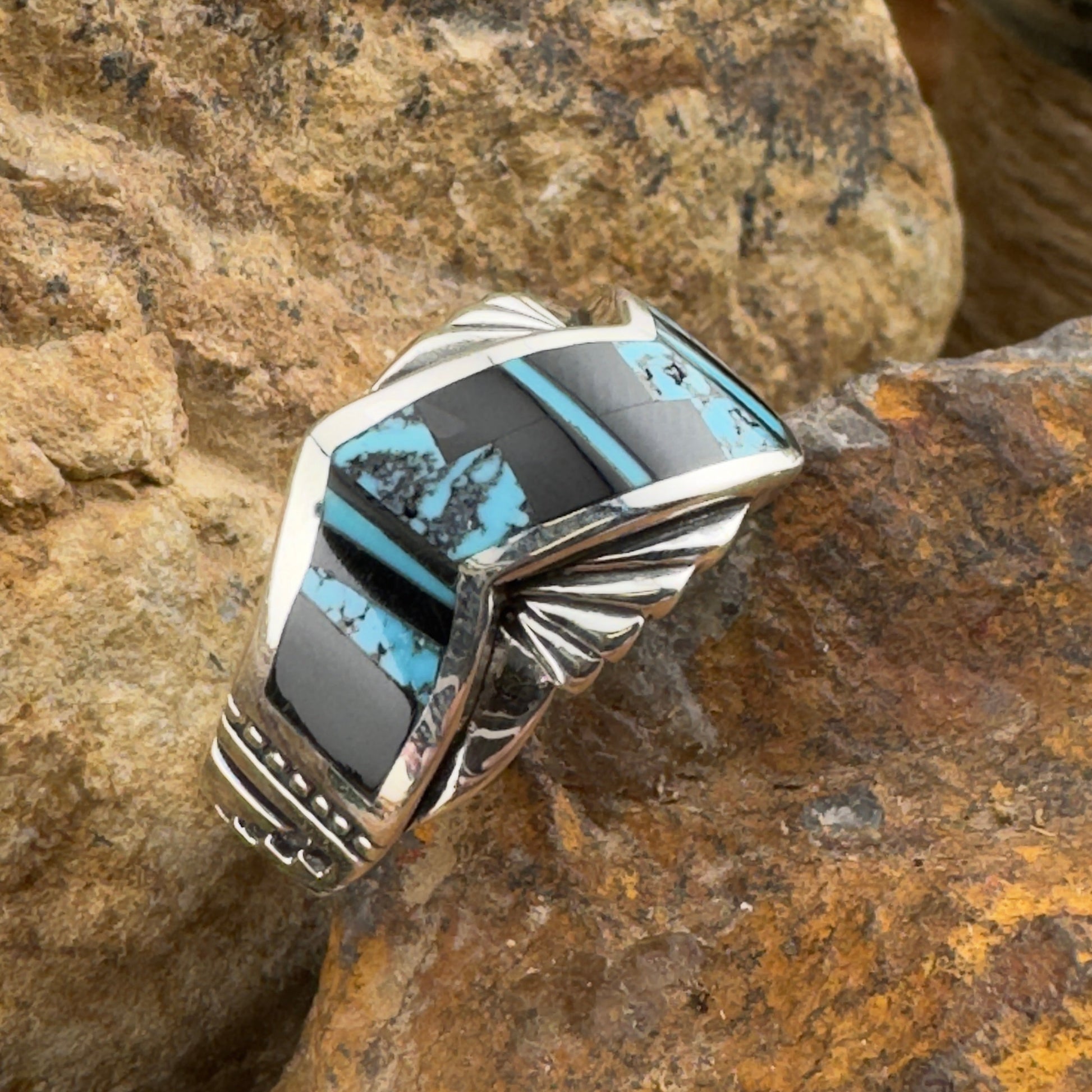 The ring is designed by David Rosales, one of the finest contemporary Southwest Artists in the world. He is the founder and co-owner of Supersmiths, Inc. of Gallup, NM.