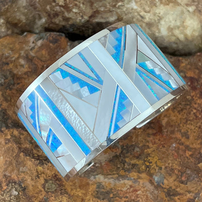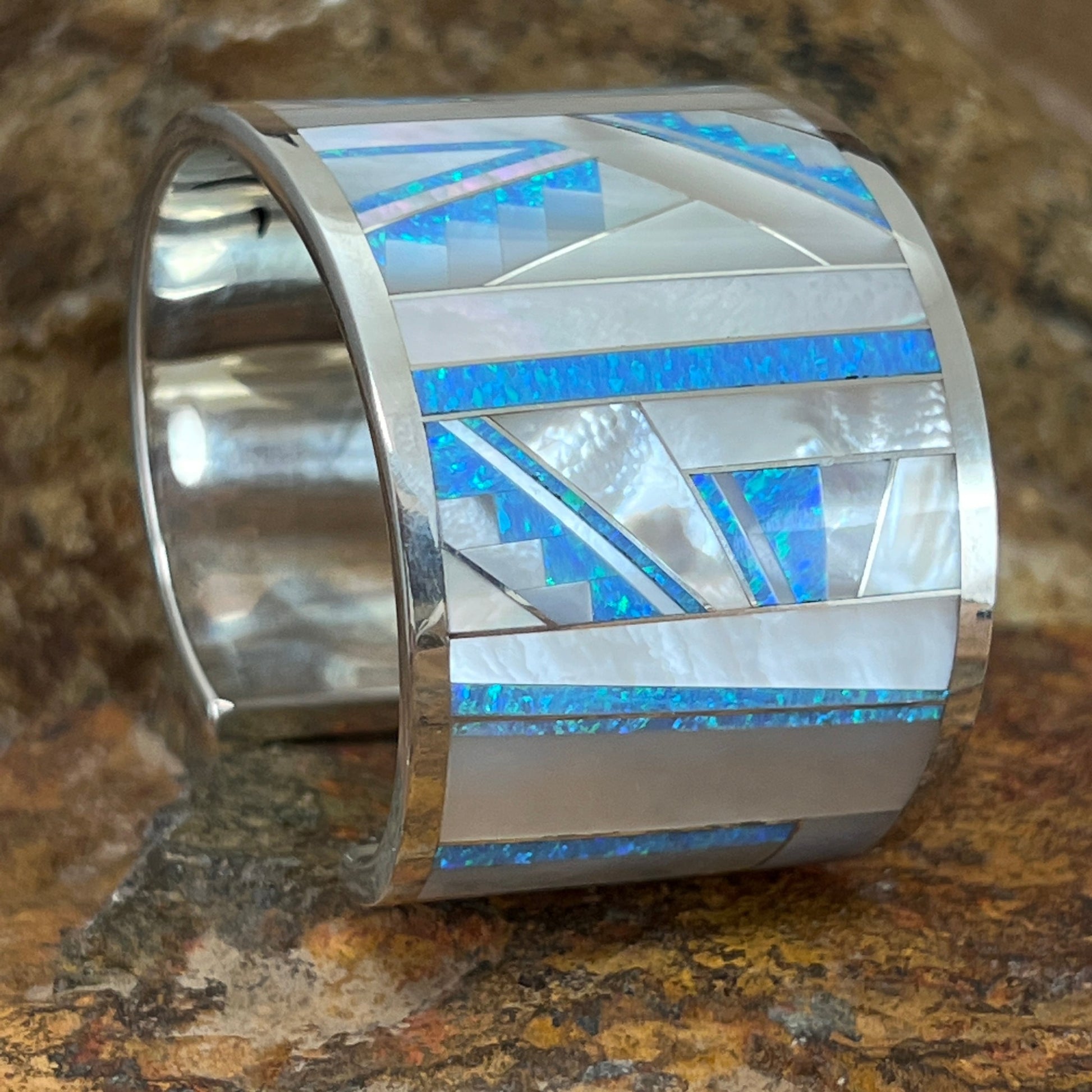 This Beautiful Sterling Silver Bracelet, as part of the NEW Mystic Pearl collection, feature Mother of Pearl and Lab Opal in a Fancy Inlay Pattern. Choose Cuff Size based on Total Circumference of Wrist.