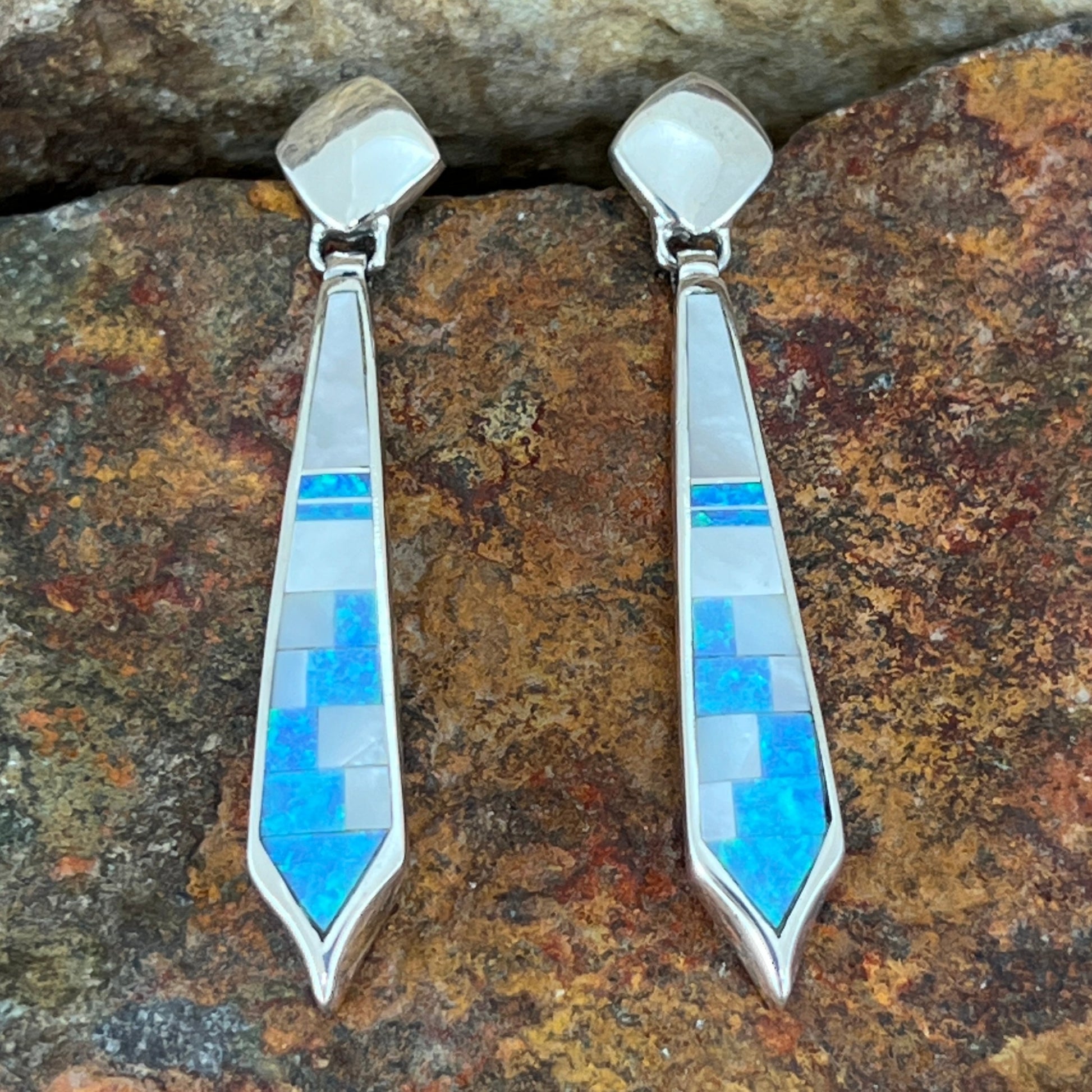 These gorgeous Sterling Silver Earrings, as part of the Mystic Pearl collection, feature Mother of Pearl and Lab Opal in a Inlay Pattern.
