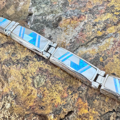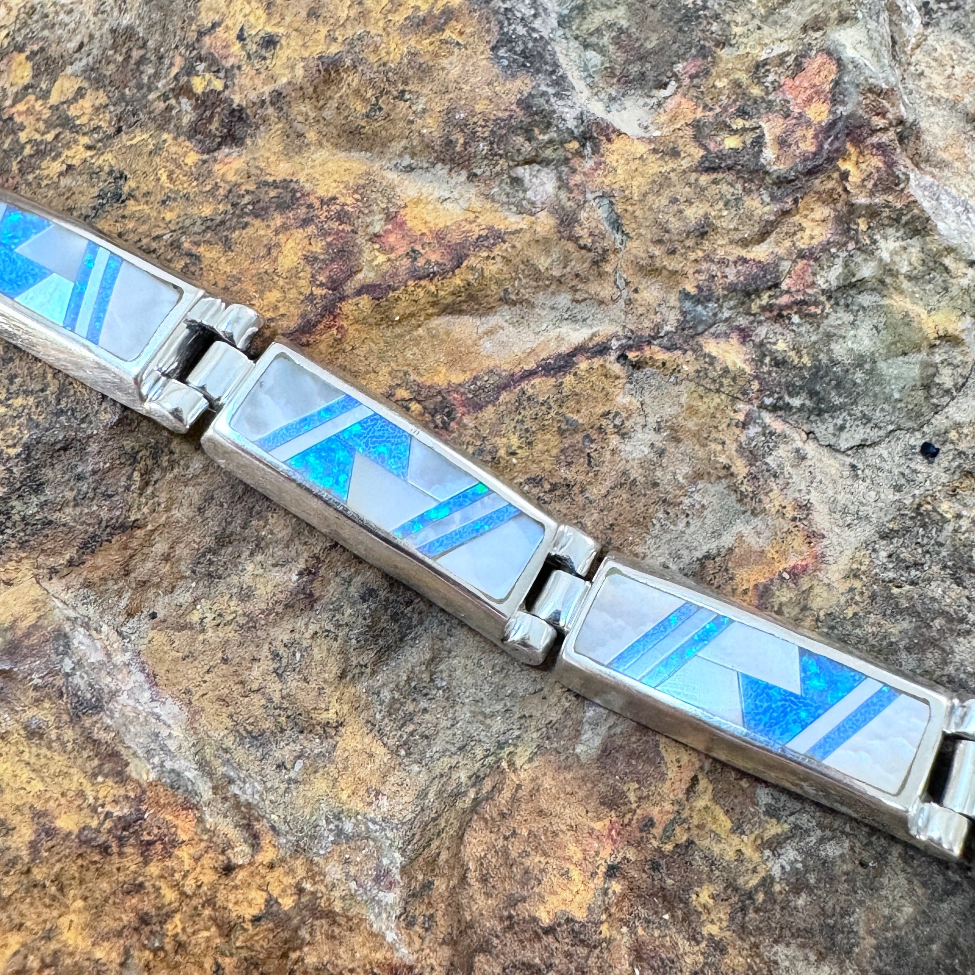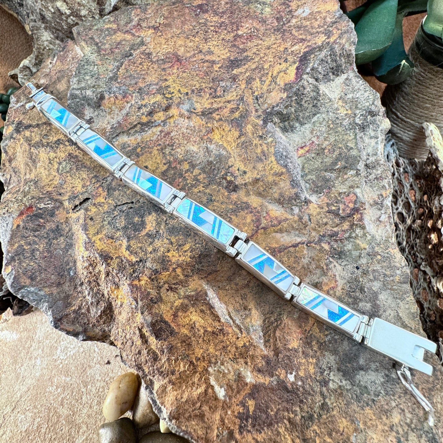 This Beautiful Sterling Silver Bracelet, as part of the Mystic Pearl collection, features Mother of Pearl and Lab Opal in a Inlay Pattern