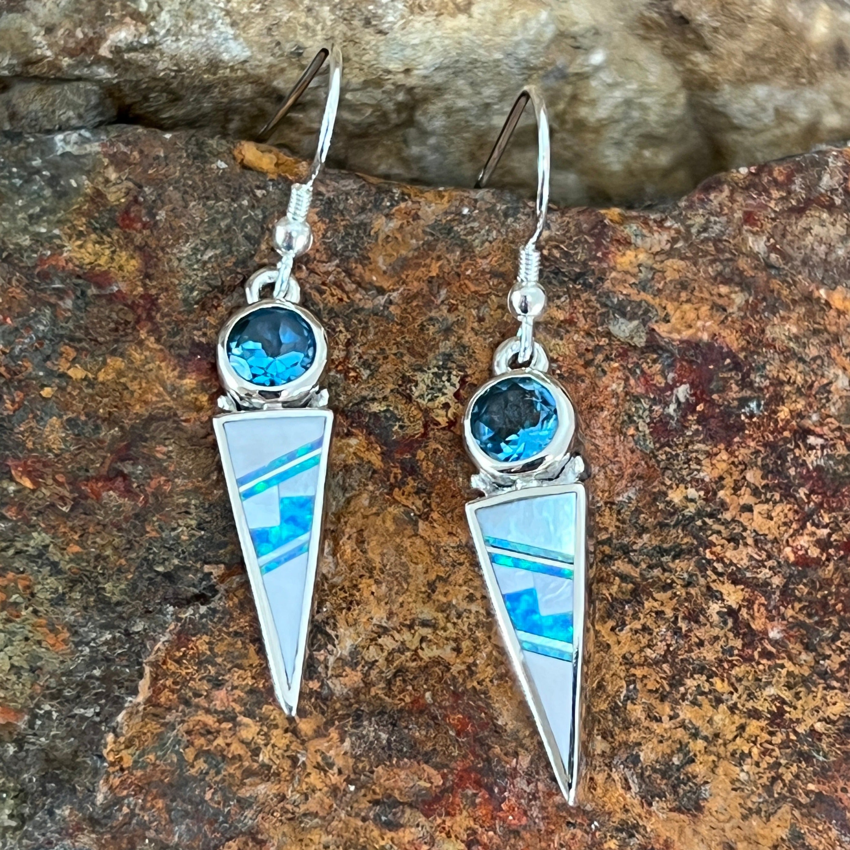 These gorgeous Sterling Silver Earrings, as part of the Mystic Pearl collection, feature Mother of Pearl and Lab Opal with Blue Topaz.
