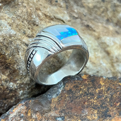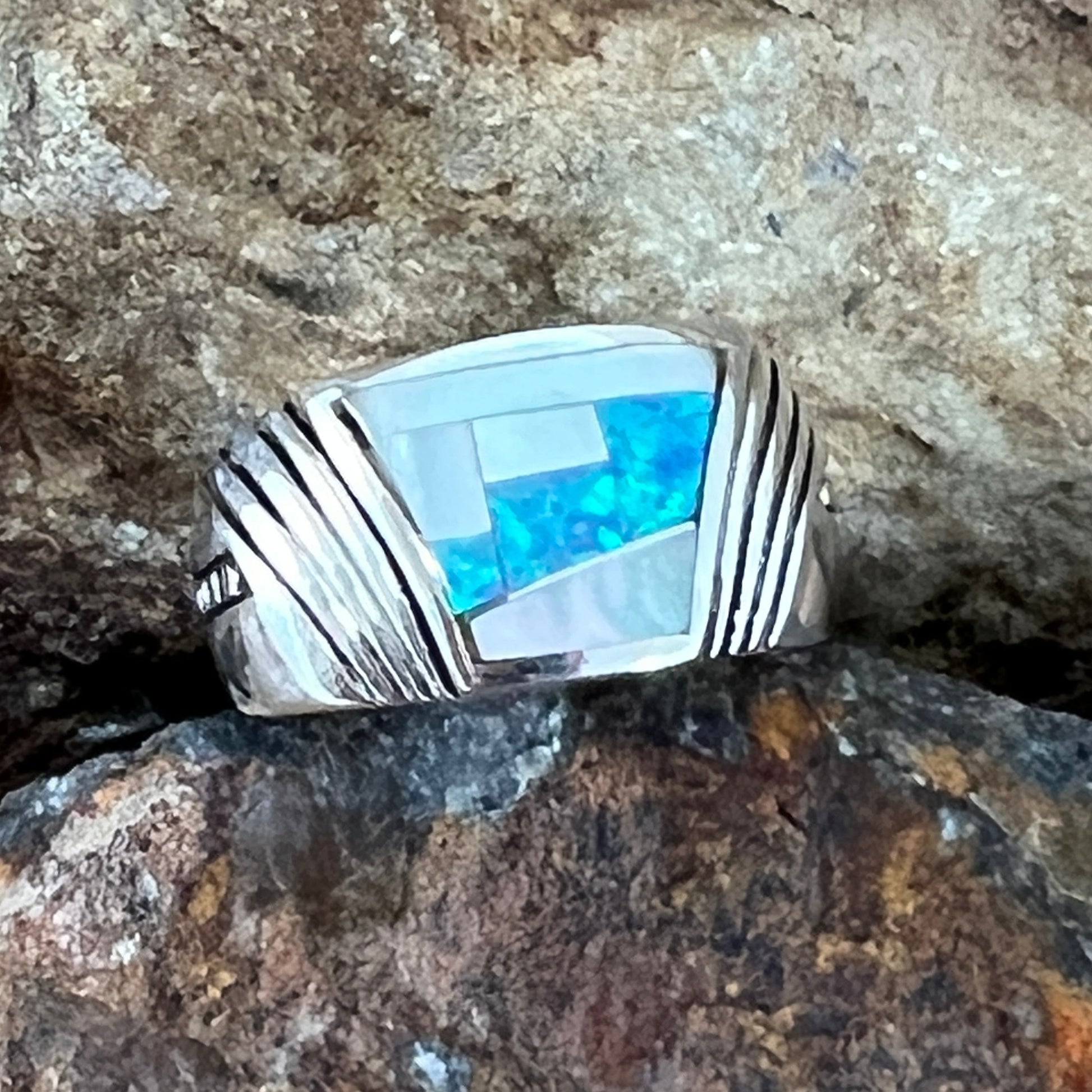 This beautiful Sterling Silver Ring, as part of the NEW Mystic Pearl collection, feature Mother of Pearl and Lab Opal in a Fancy Inlay Pattern.