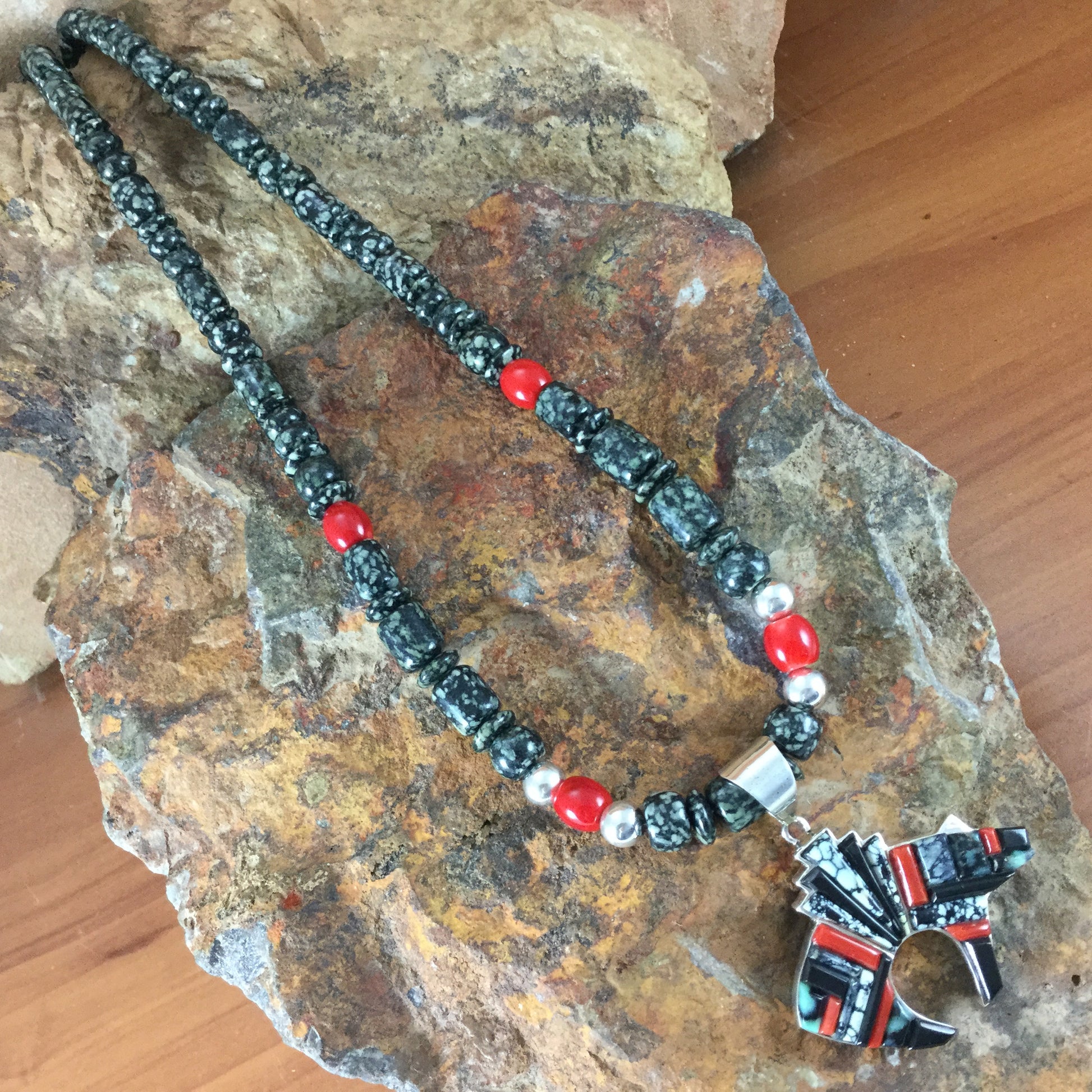 This beautiful Sterling Silver Bear w/ Medicine Pack Pendant as part of the New West Collection, features Black Jade, Landers Turquoise and Red Coral. Matching Beaded Necklace with Spider Jasper, Apple Coral and Silver Beads