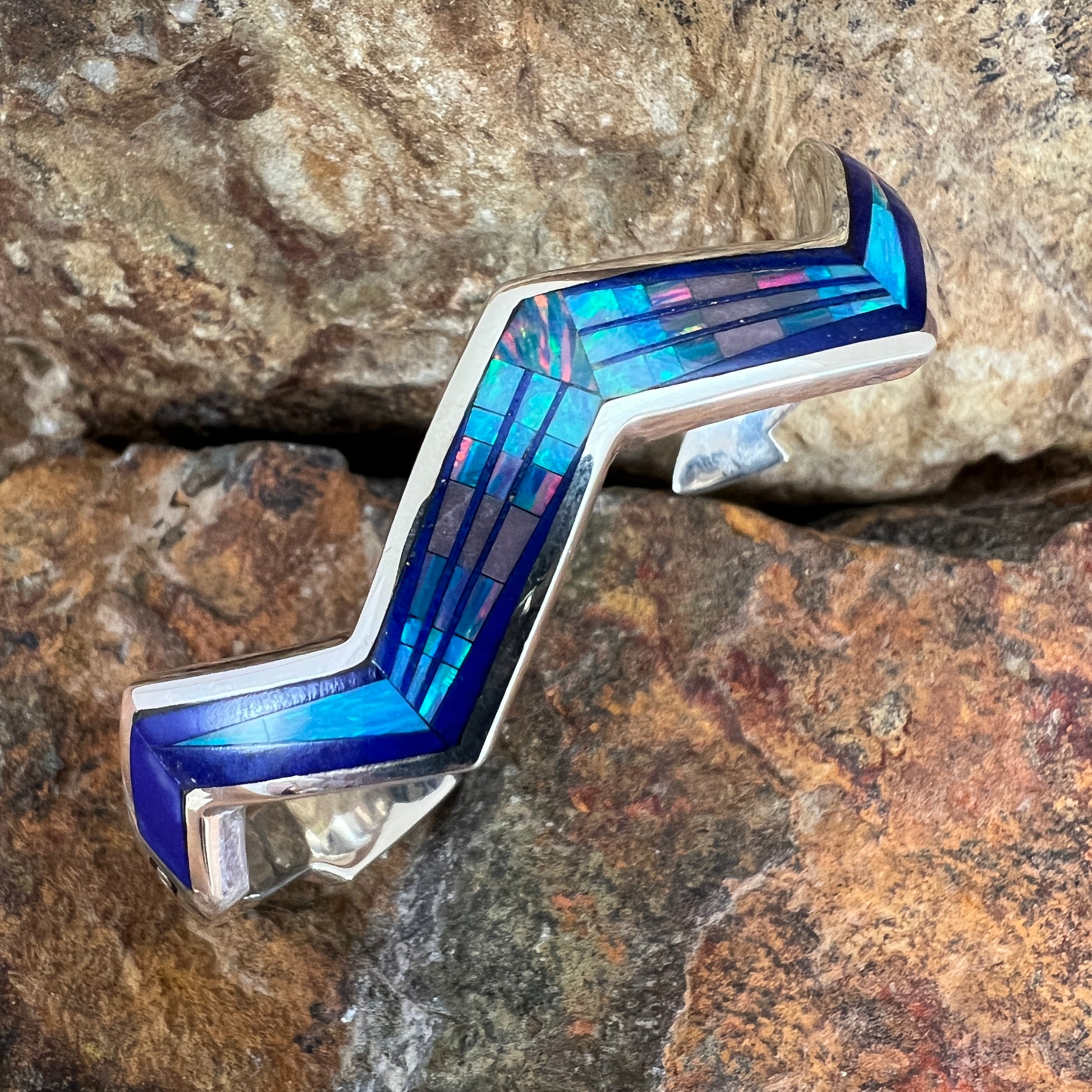 David is known for his innovative use of stone combinations, blending materials like turquoise, sugilite, opal, lapis, black jade, and coral into intricate inlay patterns. His commitment to exceptional craftsmanship and cutting-edge style has helped shape the identity of David Rosales Designs, a premier Native jewelry brand recognized nationwide.