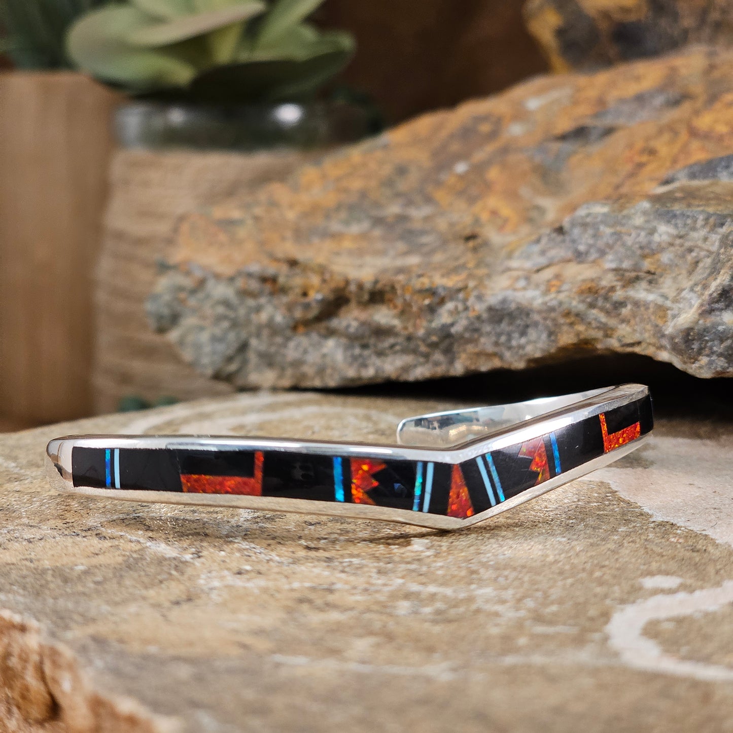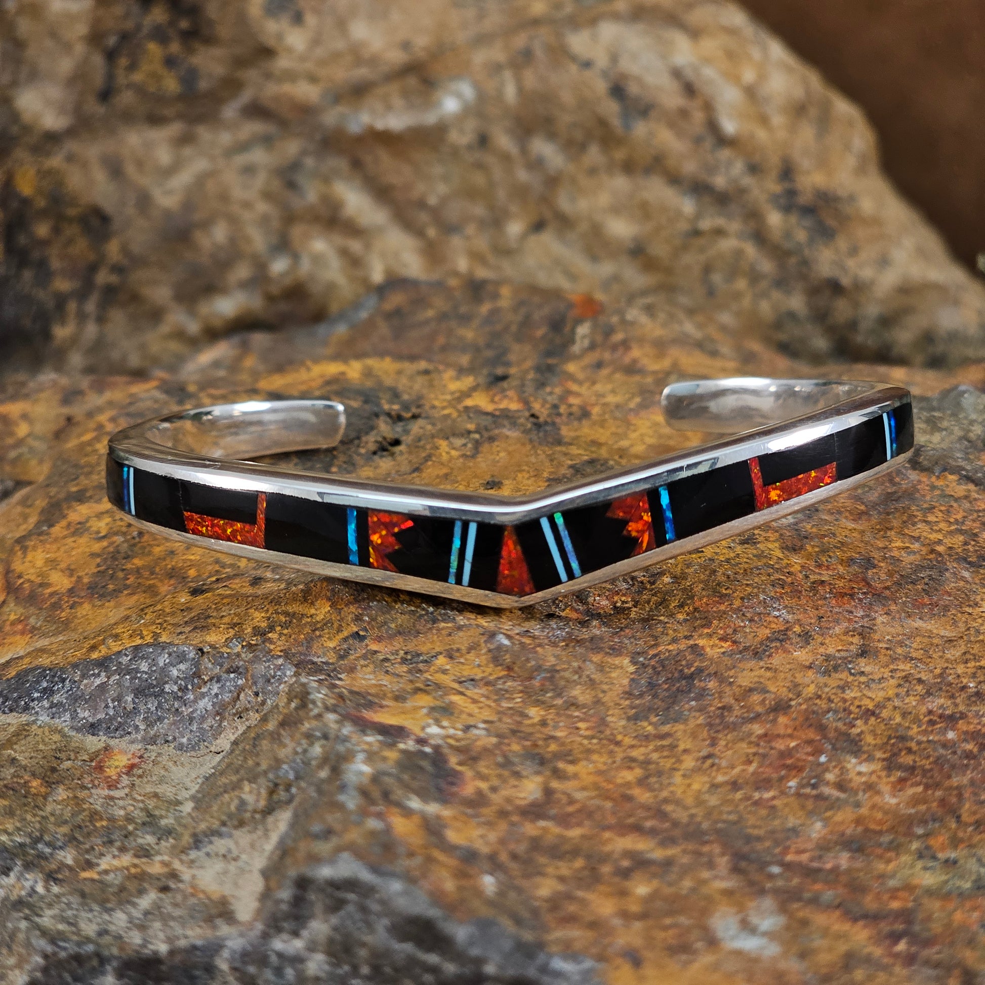 This Beautiful Sterling Silver Bracelet, as part of the Red Moon Collection, features a Fancy Inlay pattern of Black Jade, Kingman Turquoise and Blue, Green & Red Cultured Opal. Choose Bracelet Size based on Total Circumference of Wrist.