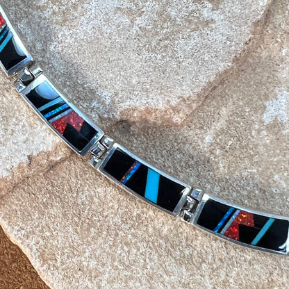 This gorgeous Sterling Silver Necklace, as part of the Red Moon Collection, features Black Jade, Kingman Turquoise and Blue, Green & Red Lab Opal.