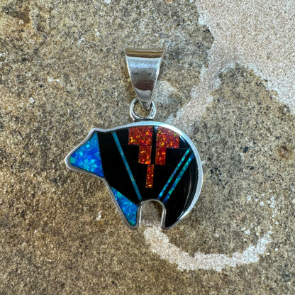 This beautiful Sterling Silver Bear Pendant as part of the Red Moon Collection, features a Fancy Inlay Pattern of Black Jade, Kingman Turquoise and Blue, Green & Red Lab Opal. It is reversible with an etched, polished design and Bear Heartline.