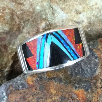 This beautiful Sterling Silver Ring, as part of the Red Moon Collection, features Black Jade, Kingman Turquoise and Blue, Green & Red Lab Opal in a Fancy Inlay Pattern. when ordering.