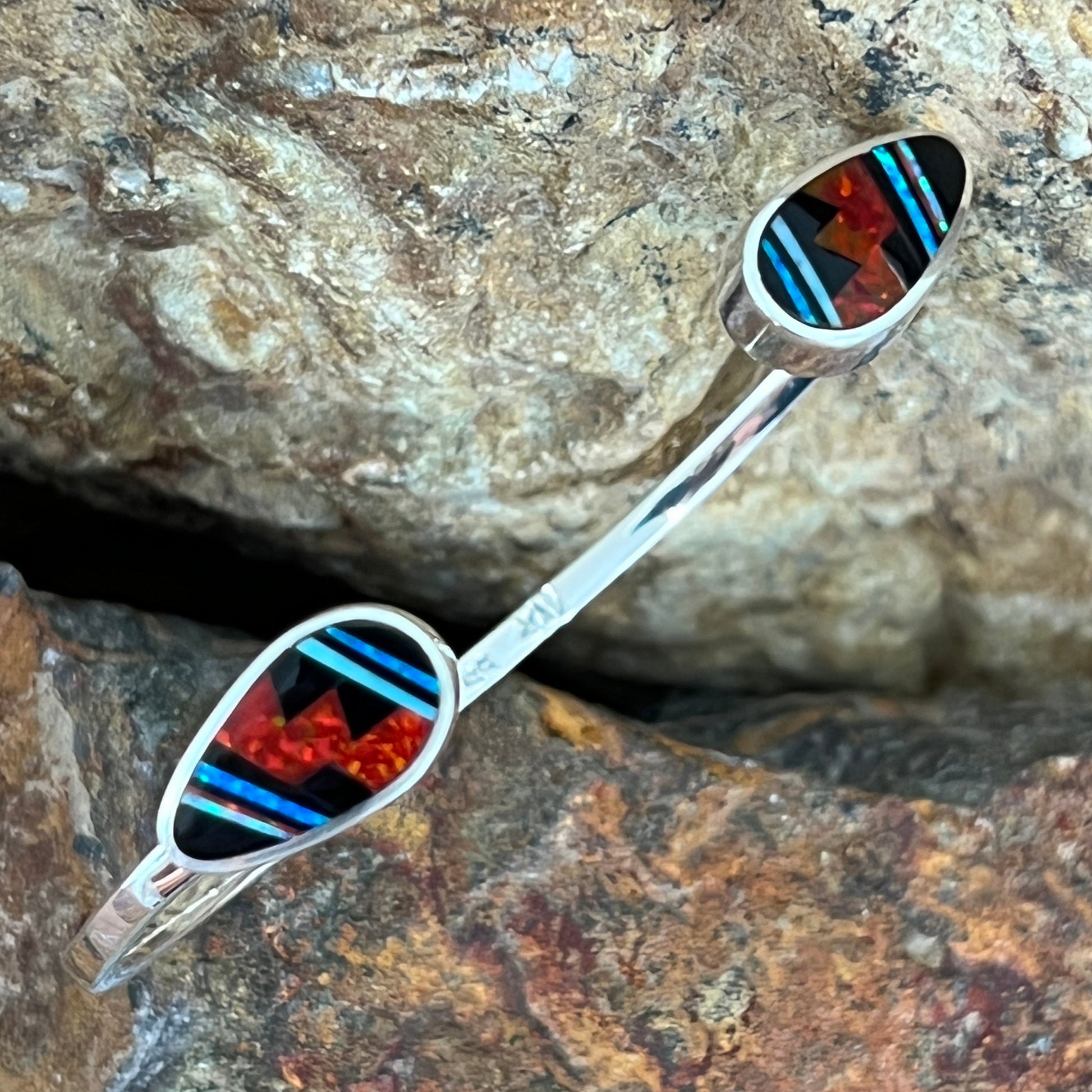 This Beautiful Sterling Silver Bracelet shown in the Red Moon Collection, features Black Jade, Kingman Turquoise and Blue, Green & Red Lab Opal. It sets with the Inlay drops at the top of the wrist. Choose Bracelet Size based on Total Circumference of Wrist.