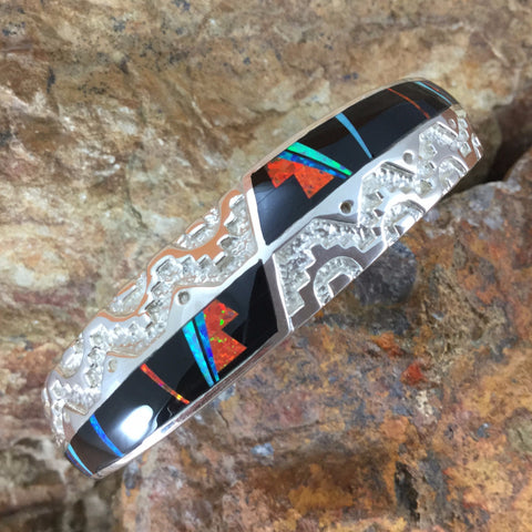 This Beautiful Sterling Silver Bracelet shown in the Red Moon Collection, features Black Jade, Kingman Turquoise and Blue, Green & Red Lab Opal. Choose Bracelet Size based on Total Circumference of Wrist.