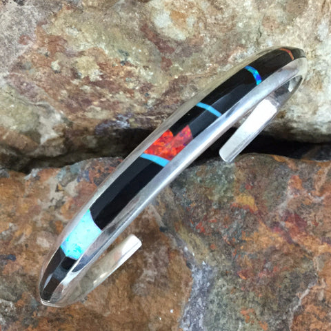 This Beautiful Sterling Silver Bracelet, as part of the Red Moon collection, features Black Jade, Kingman Turquoise and Blue, Green & Red Cultured Opal. Choose Bracelet Size based on Total Circumference of Wrist.