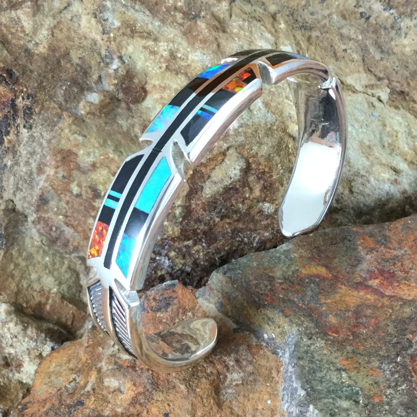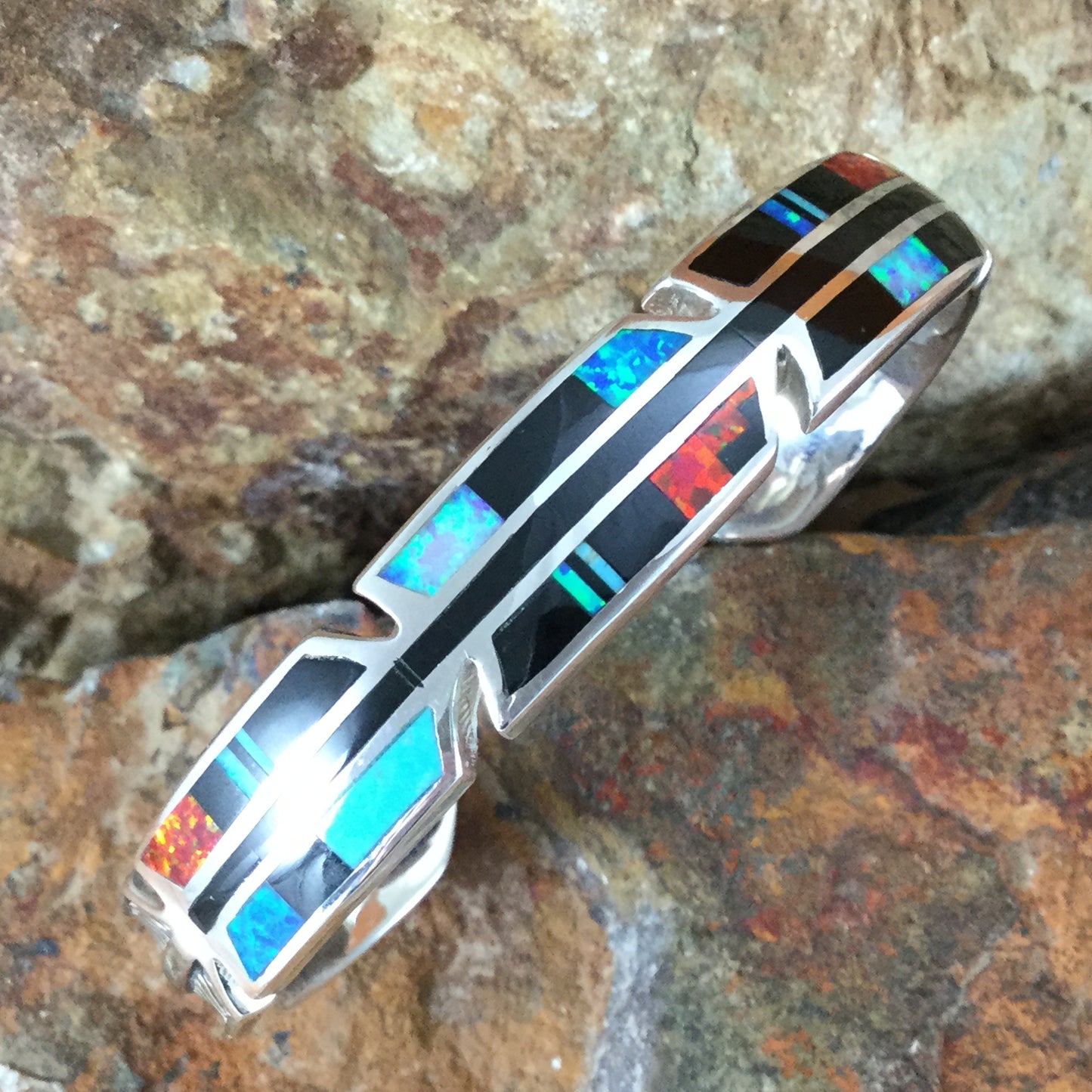 This Beautiful Sterling Silver Bracelet shown in the Red Moon Collection, features Black Jade, Kingman Turquoise and Blue, Green & Red Lab Opal. Choose Bracelet Size based on Total Circumference of Wrist.