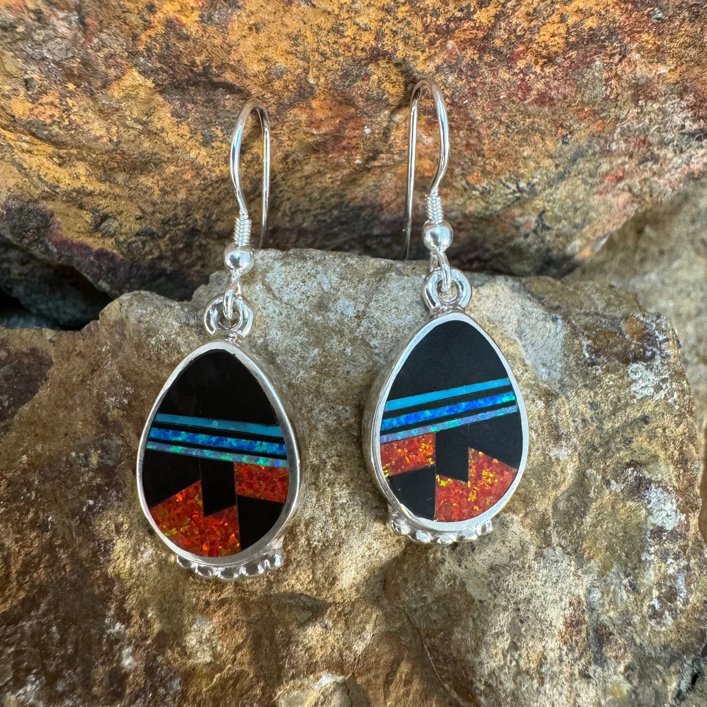 These gorgeous Sterling Silver Earrings, as part of the Red Moon Collection, features Black Jade, Kingman Turquoise and Blue, Green & Red Lab Opal.