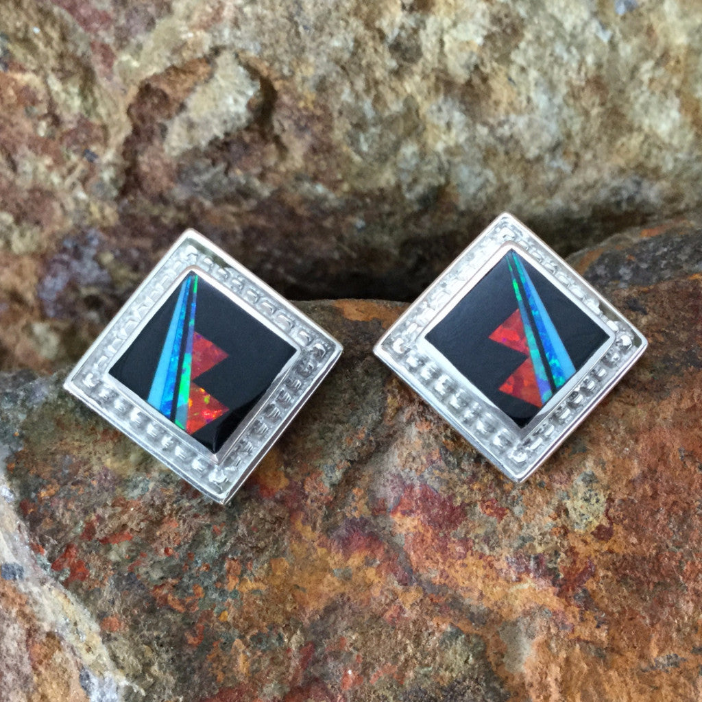 These gorgeous Sterling Silver Earrings, as part of the Red Moon Collection, features Black Jade, Kingman Turquoise and Blue, Green & Red Lab Opal.