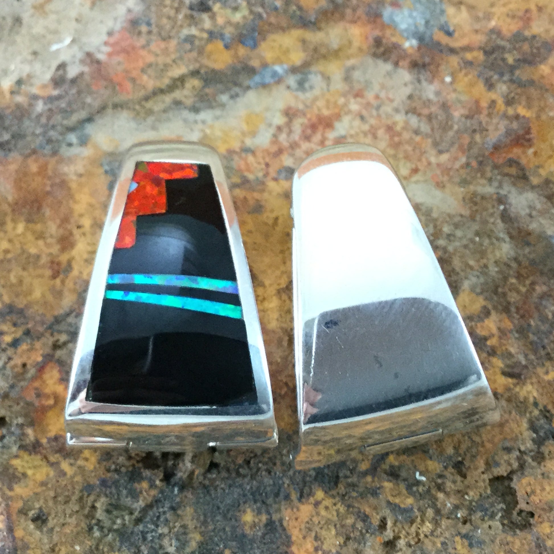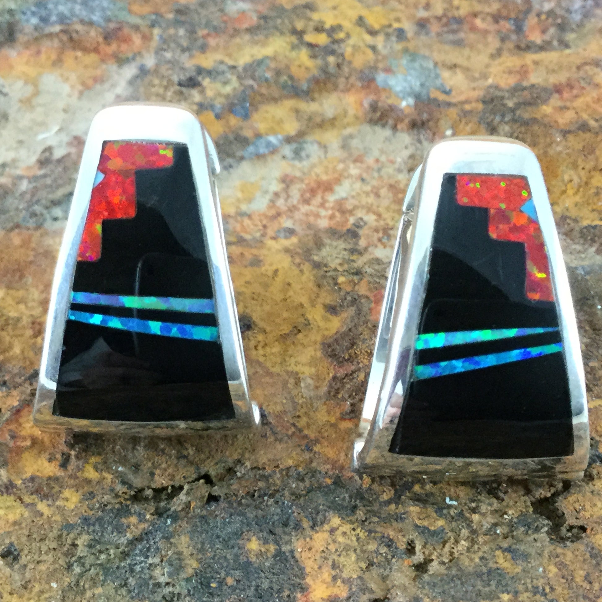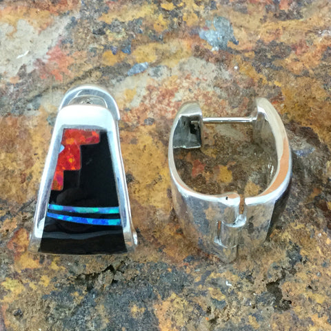 These gorgeous Sterling Silver Huggie Earrings, as part of the Red Moon Collection, feature Black Jade, Kingman Turquoise and Red, Blue and Blue/Green Lab Opal. They are reversible to just show a Sterling Silver Polished finish.