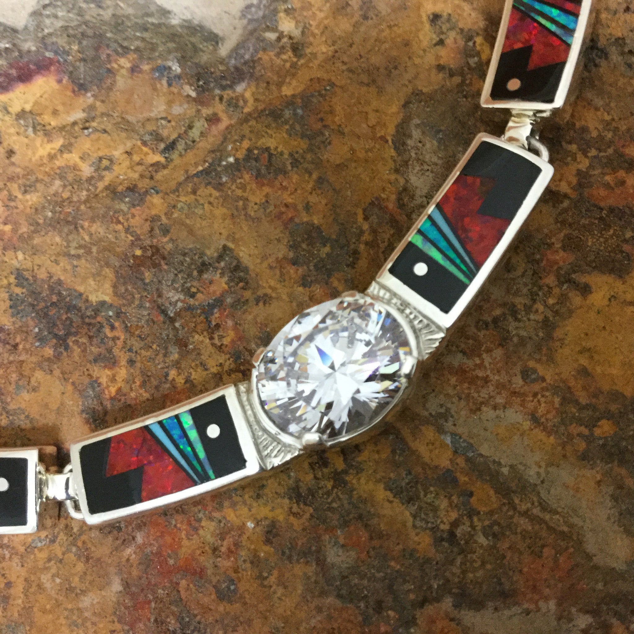 This gorgeous Sterling Silver Necklace, as part of the Red Moon Collection, features Black Jade, Kingman Turquoise and Blue, Green & Red Lab Opal, as well as 3 large oval Cubic Zirconia Gemstones. Includes Omega Chain.
