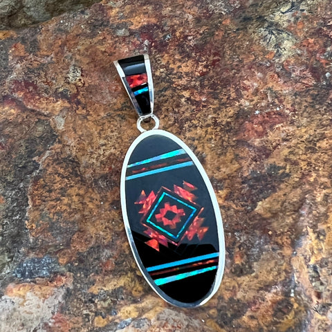 This beautiful Sterling Silver Pendant, as part of the Red Moon Collection, features Black Jade, Kingman Turquoise and Blue, Green & Red Lab Opal in a Fancy Inlay Pattern.
