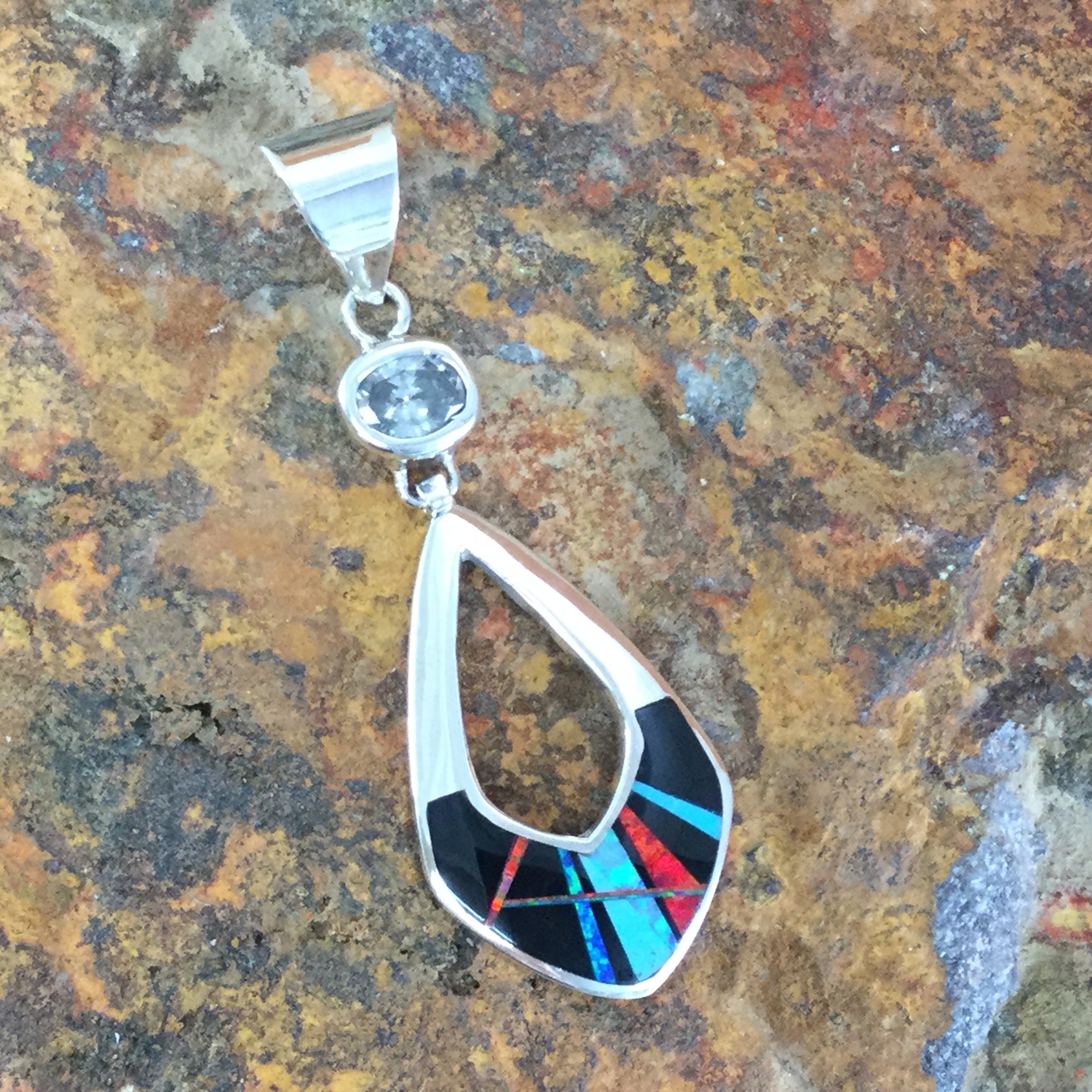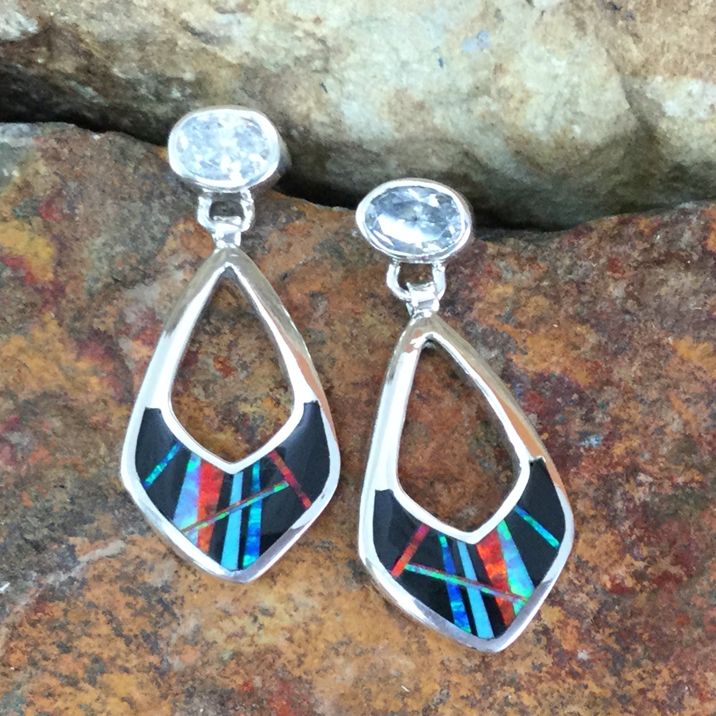 This beautiful Sterling Silver Pendant, as part of the Red Moon collection, features Black Jade, Kingman Turquoise and Blue, Green & Red Cultured Opal. Posts are Cubic Zirconia in a Sterling Silver setting