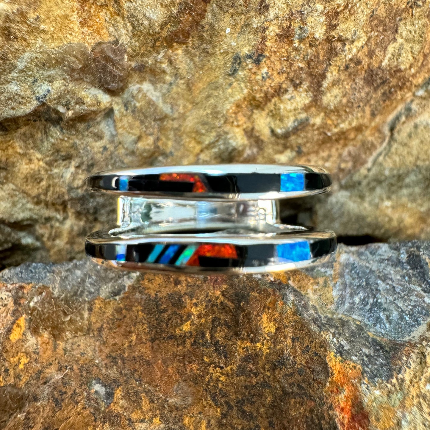 This beautiful Sterling Silver Ring, as part of the Red Moon Collection features Black Jade, Kingman Turquoise and Blue, Green & Red Cultured Opal.
