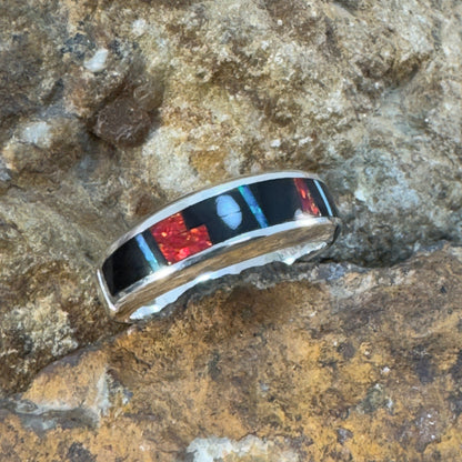This beautiful Sterling Silver Ring as part of the Red Moon Collection, features Black Jade, Kingman Turquoise and Blue, Green & Red Lab Opal.