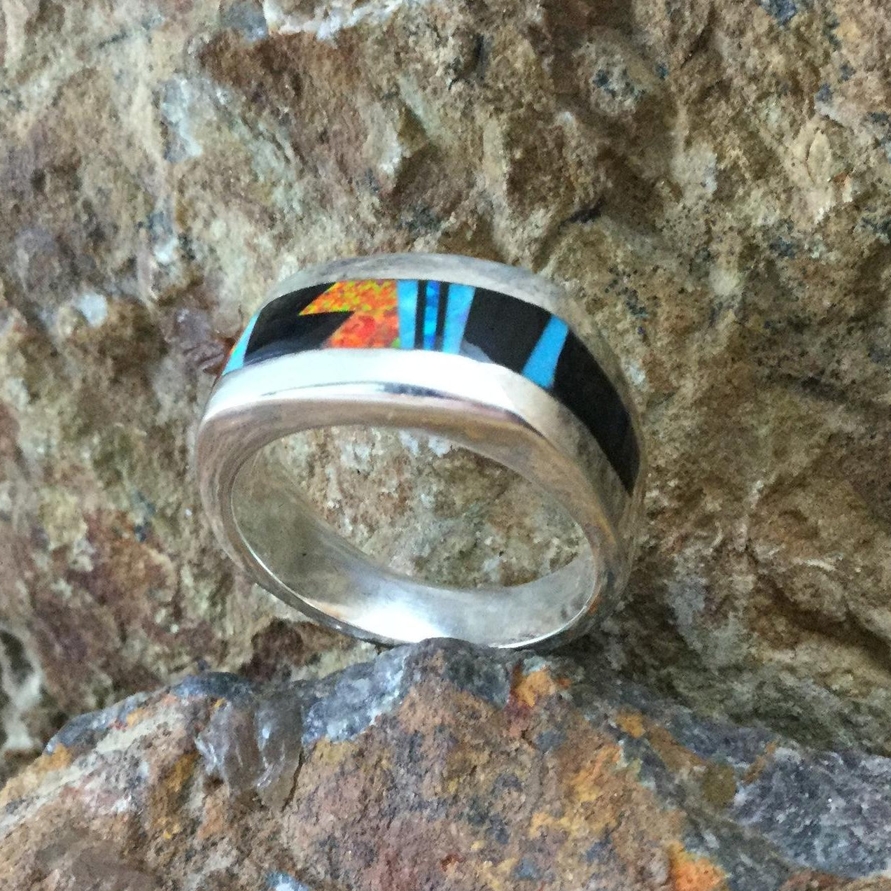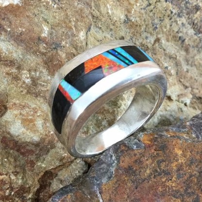 This beautiful Sterling Silver Ring, as part of the Red Moon Collection, features Black Jade, Kingman Turquoise and Blue, Green & Red Lab Opal. when ordering.