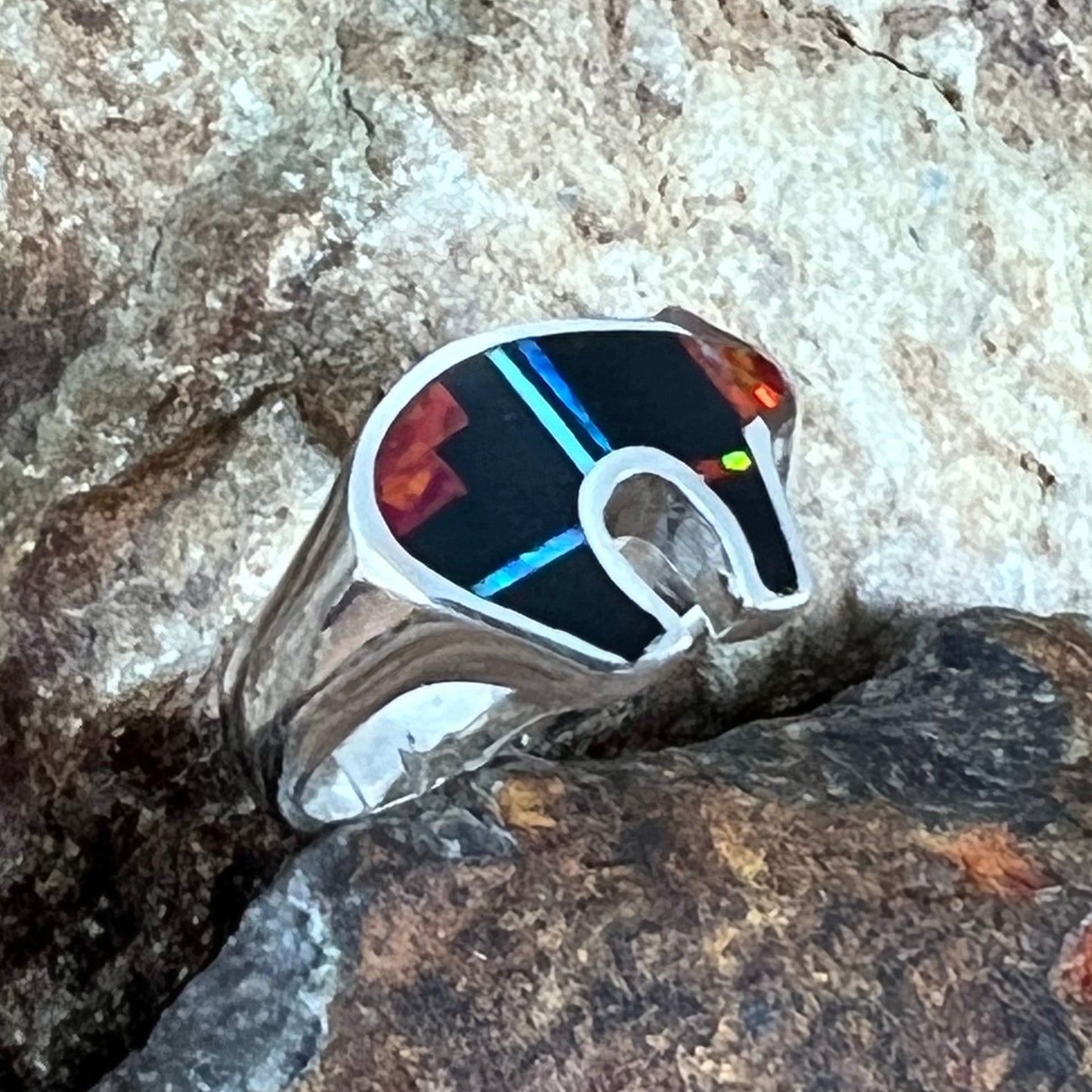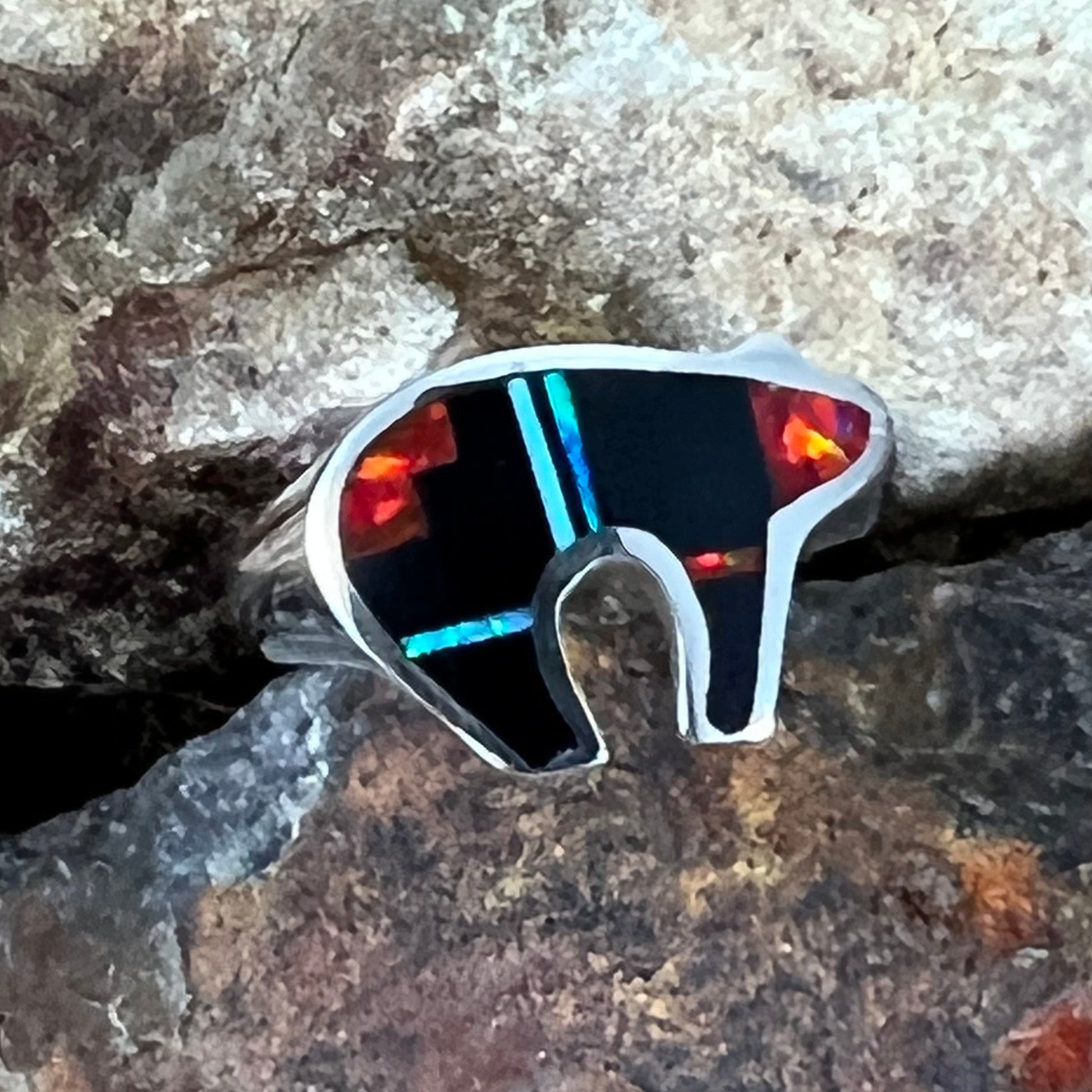 This beautiful Sterling Silver Ring Bear, as part of the Red Moon Collection, features Black Jade, Kingman Turquoise and Blue, Green & Red Lab Opal. when ordering.