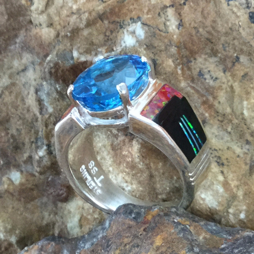 This beautiful Sterling Silver Ring, as part of the Red Moon Collection features Black Jade, Kingman Turquoise and Blue, Green & Red Lab Opal with a large Blue Topaz.