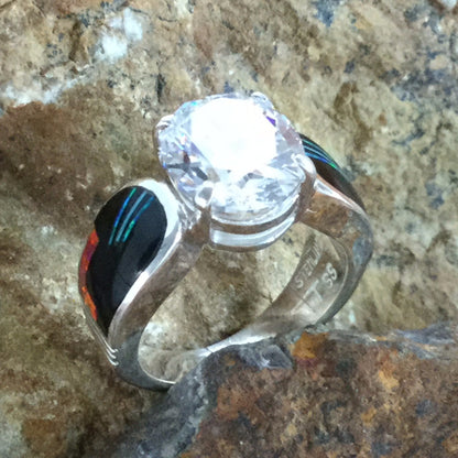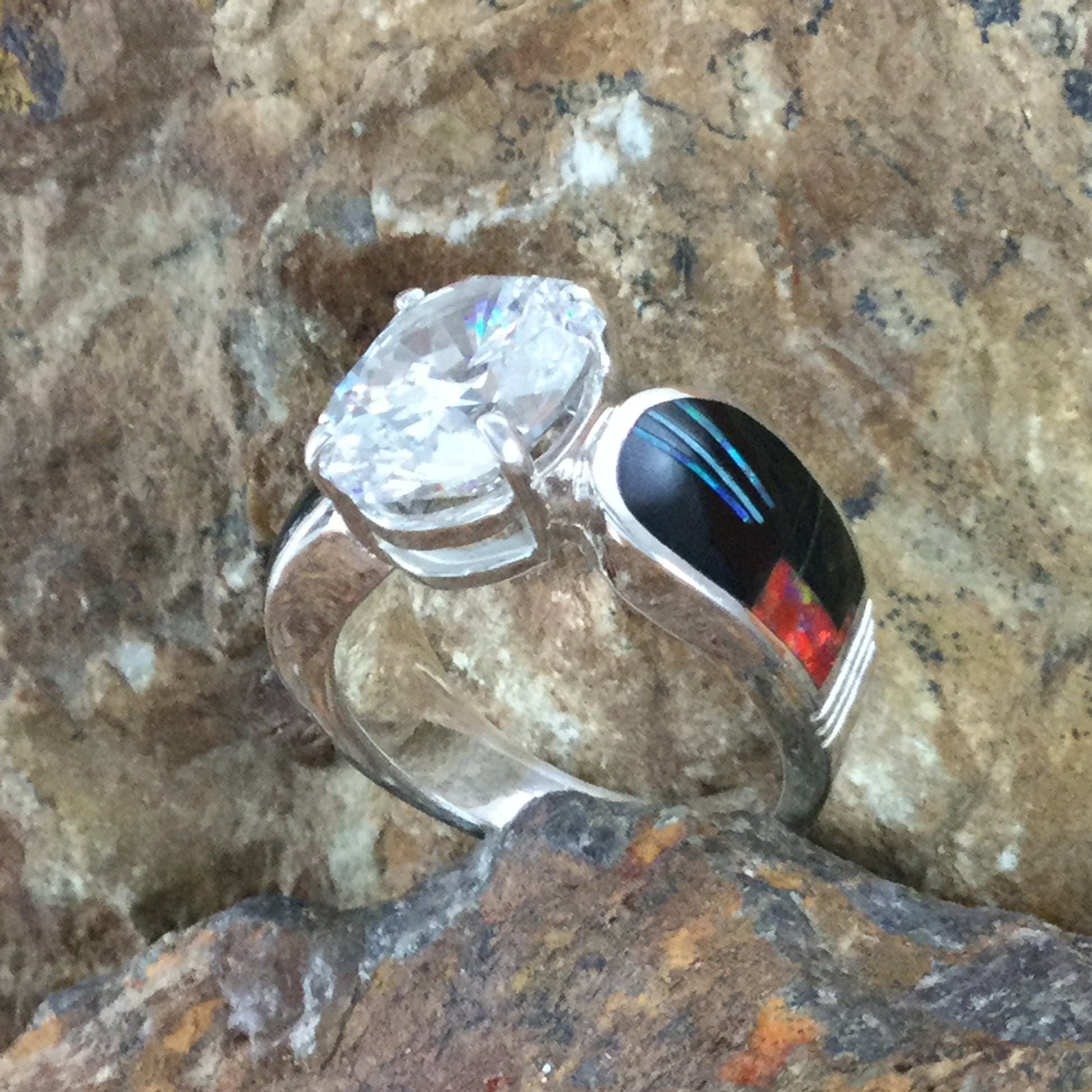 This beautiful Sterling Silver Ring, as part of the Red Moon Collection, features Black Jade Kingman Turquoise, Blue, Blue Green & Red Lab Opal, as well as Cubic Zirconia.