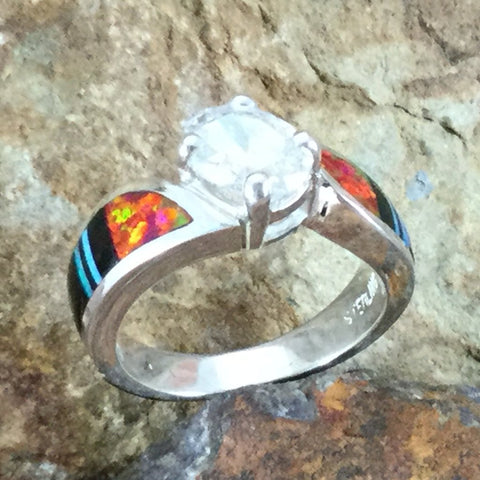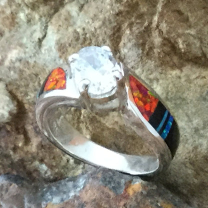 This beautiful Sterling Silver Ring, as part of the Red Moon Collection, features Black Jade, Kingman Turquoise and Blue, Green & Red Lab Opal. with a Cubic Zirconia in the center. Choose Ring Size.