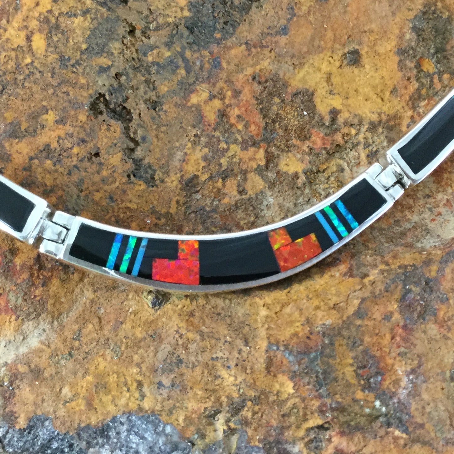This gorgeous Sterling Silver Link Necklace shown in the Red Moon Collection, feature Black Jade, Kingman Turquoise and Blue, Green & Red Lab Opal.