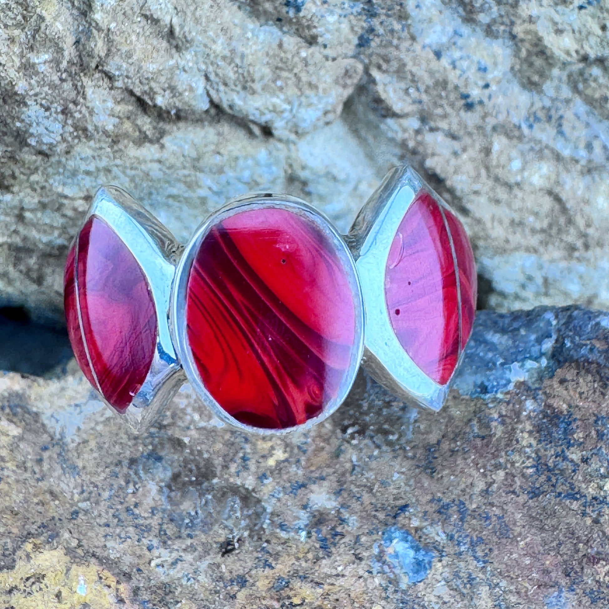 This beautiful Sterling Silver Ring, as part of the Rosarita Collection features Rosarita which is a rare and unique gemstone formed as a byproduct of gold refining. Known for its vibrant, deep red hue, this stunning material was created from molten gold slag during the smelting process.