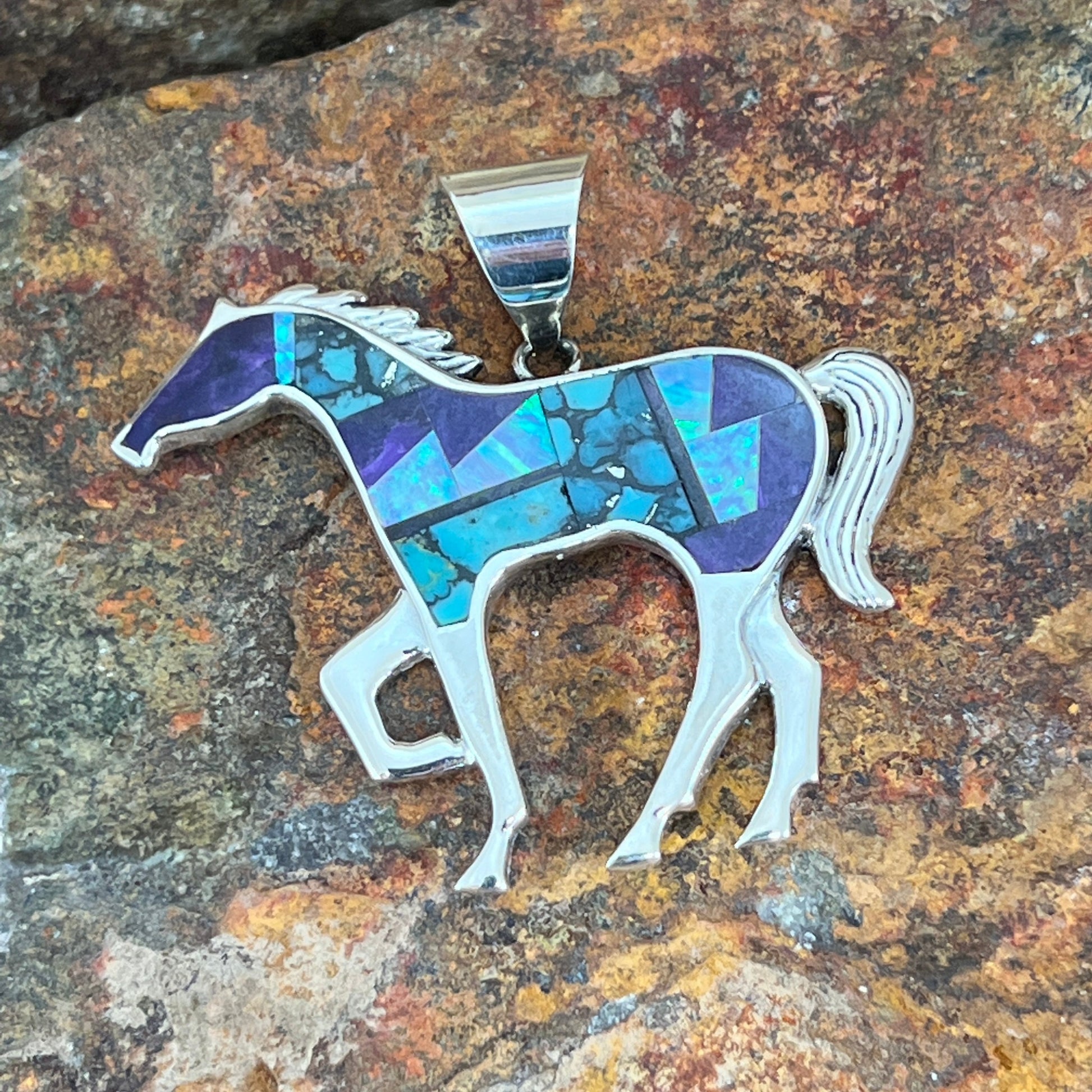 This beautiful Sterling Silver Horse Pendant, as part of the Shalako Collection, features Sugilite, Campitos Turquoise and Lab Opal in a Fancy Inlay Pattern.