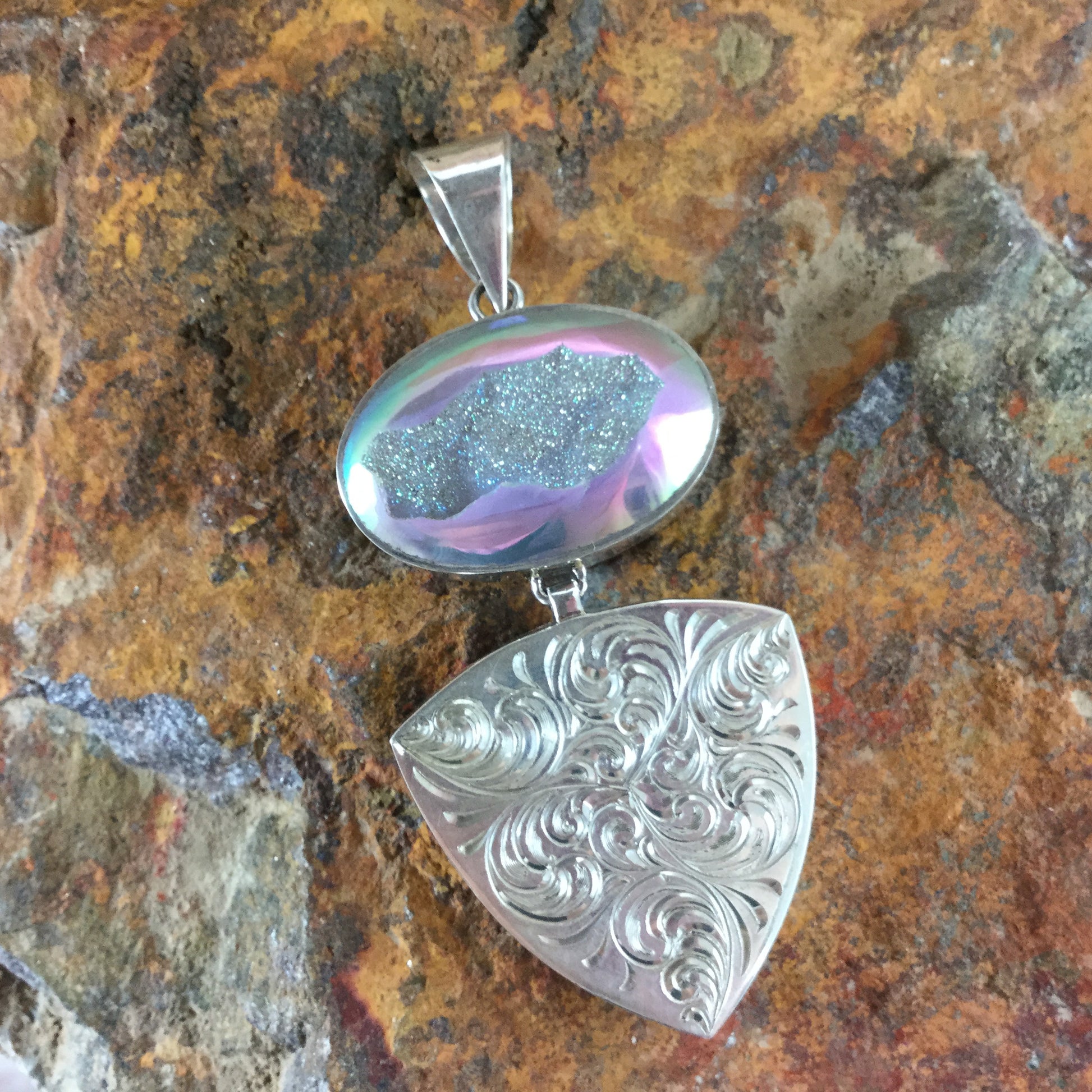 This beautiful Sterling Silver Pendant, as part of the Shalako Collection features a Fancy Inlay pattern of Sugilite, Tibetan Turquoise, Lab Opal and a 2-sided Druzy Crystal. The pendant is reversible with a highly detailed silver engraving.