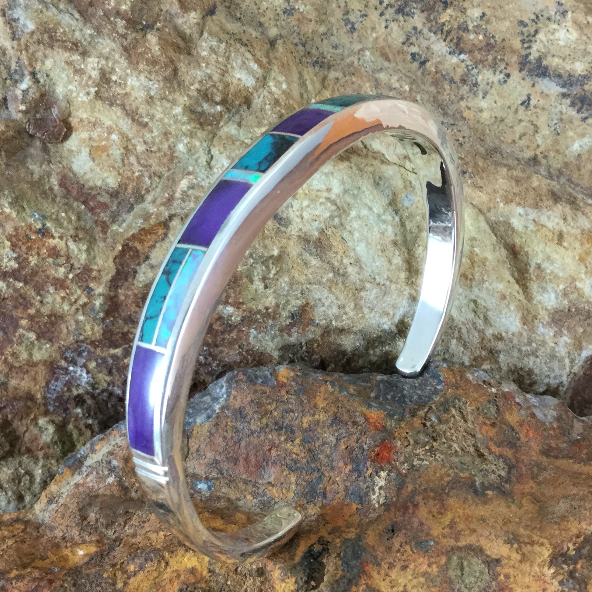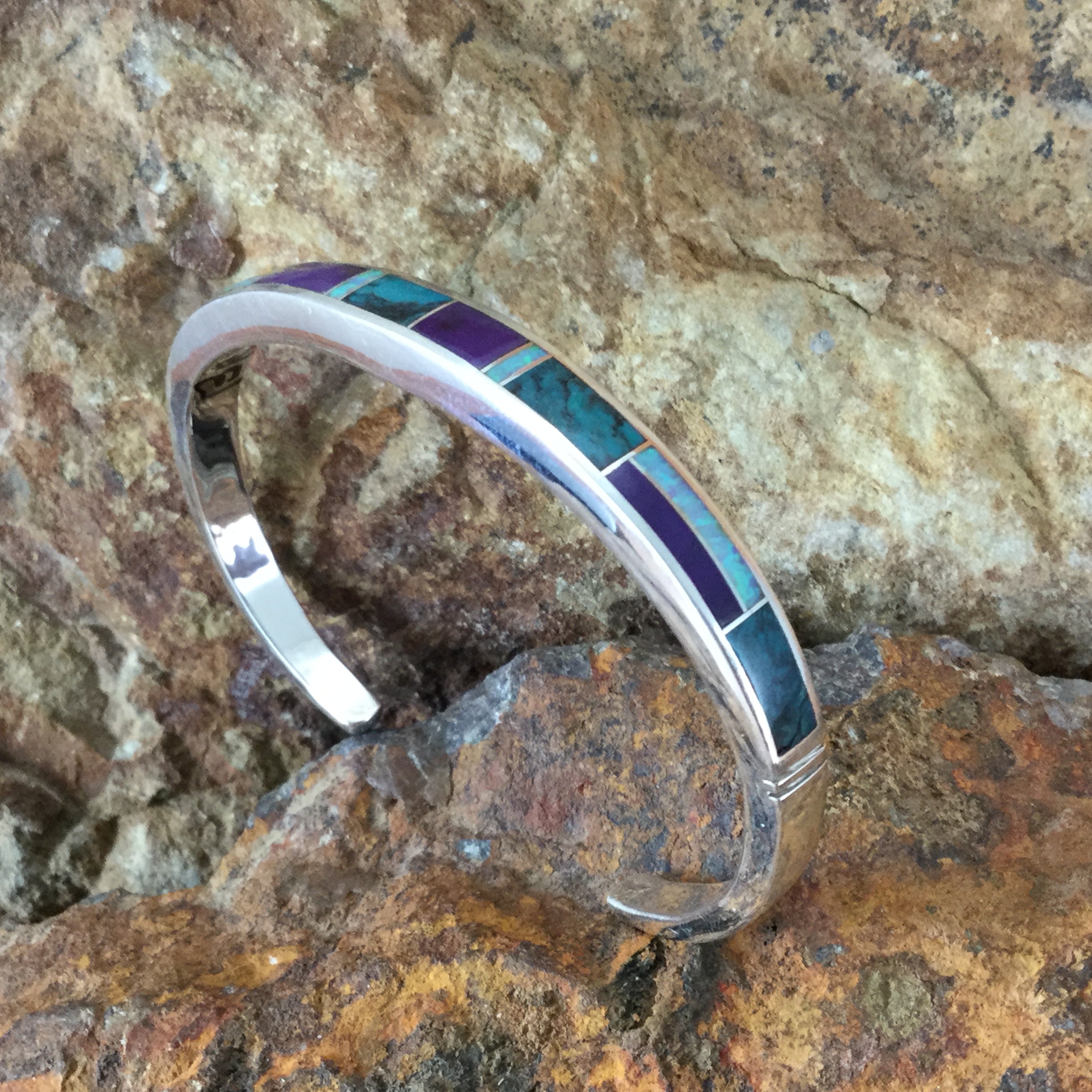 All other Native American made cuff bracelets with inlay cannot be adjusted and are typically one of a kind pieces that cannot be reordered exactly. Bracelets with a cabochon stone and silver cuff thin enough to bend may be adjusted with care.