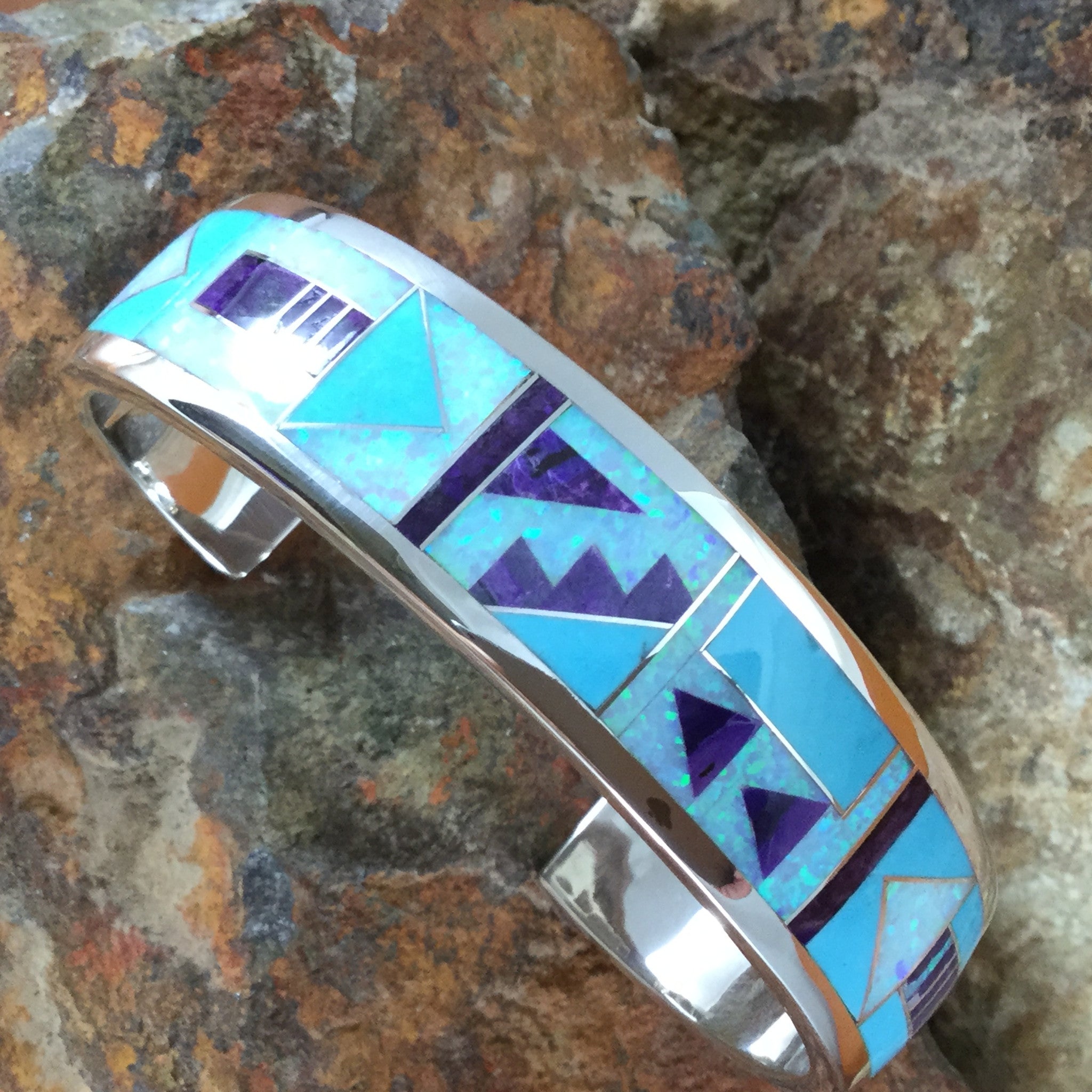 This Beautiful Sterling Silver Bracelet shown in a variation of the Shalako Collection, features Sugilite, Tibetan Turquoise and Lab Opal. Choose Bracelet Size based on Total Circumference of Wrist.
